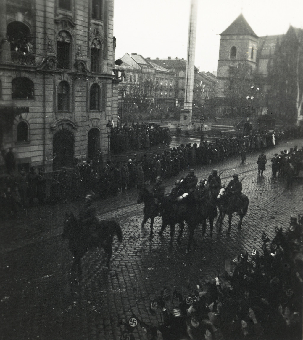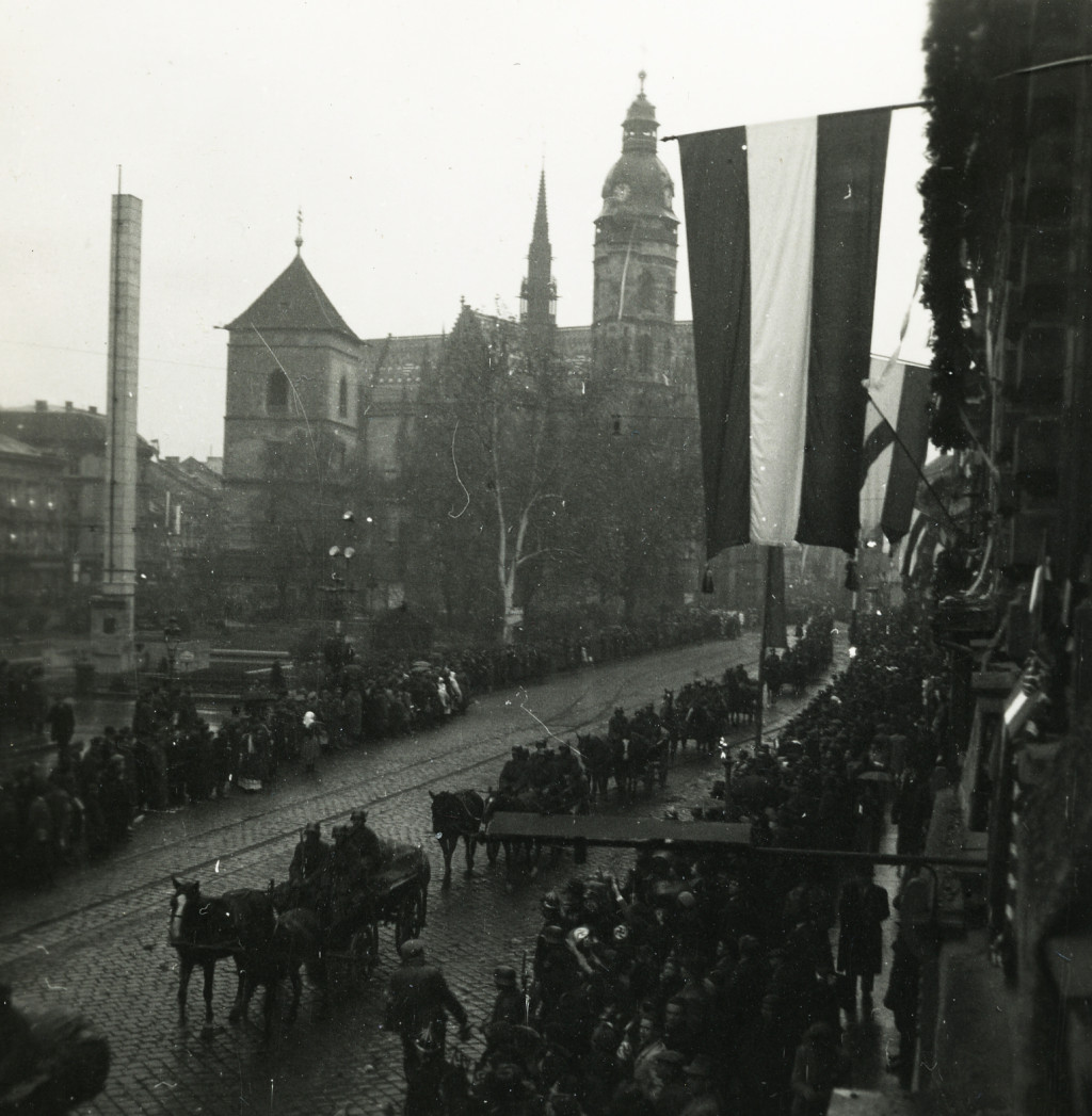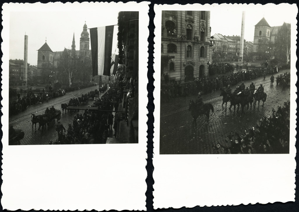 2 darab fotó, Magyar honvédek bevonulása, Kassa, Felvidék, katona, egyenruha, magyar zászló, náci horogkeresztes zászlók, 2. világháború, helytörténet, 1938, 1930-as évek, Horthy-korszak, Eredeti fotó, papírkép.