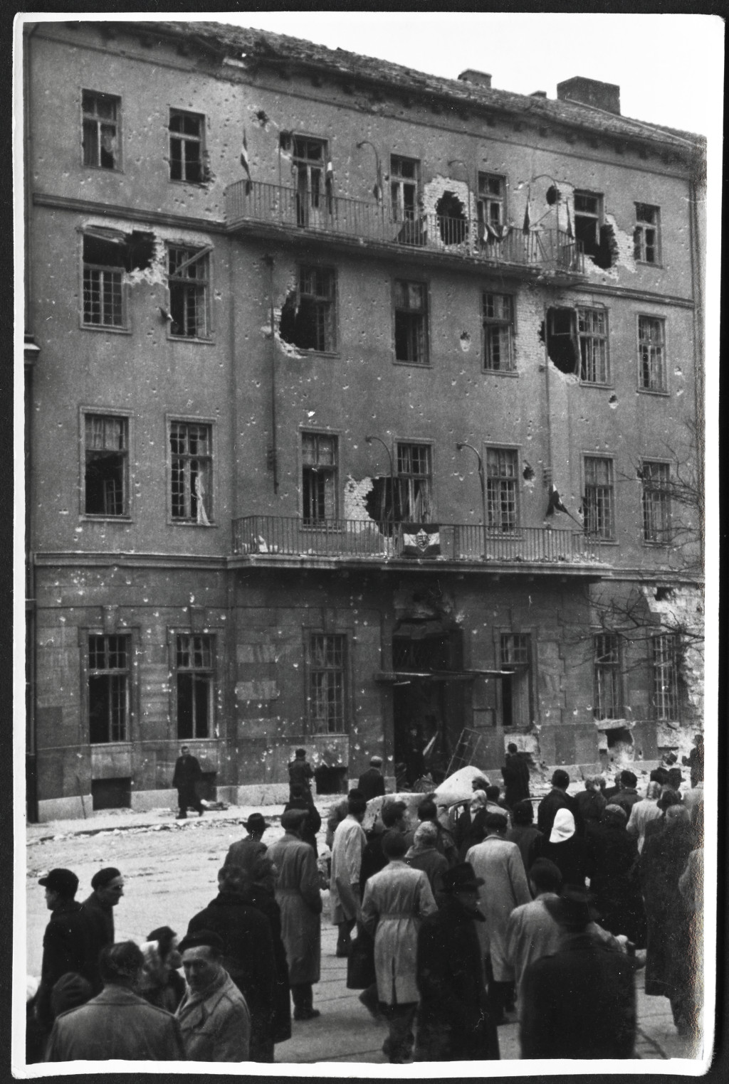 A Magyar Dolgozók Pártjának (MDP) VIII. kerületi székháza súlyosan megrongálódva, golyónyomokkal és belőtt ablakokkal, Budapest, Köztársaság tér, forradalom, ötvenhat, VIII. kerület, kommunizmus, 1956, 1950-es évek, Eredeti fotó, papírkép.