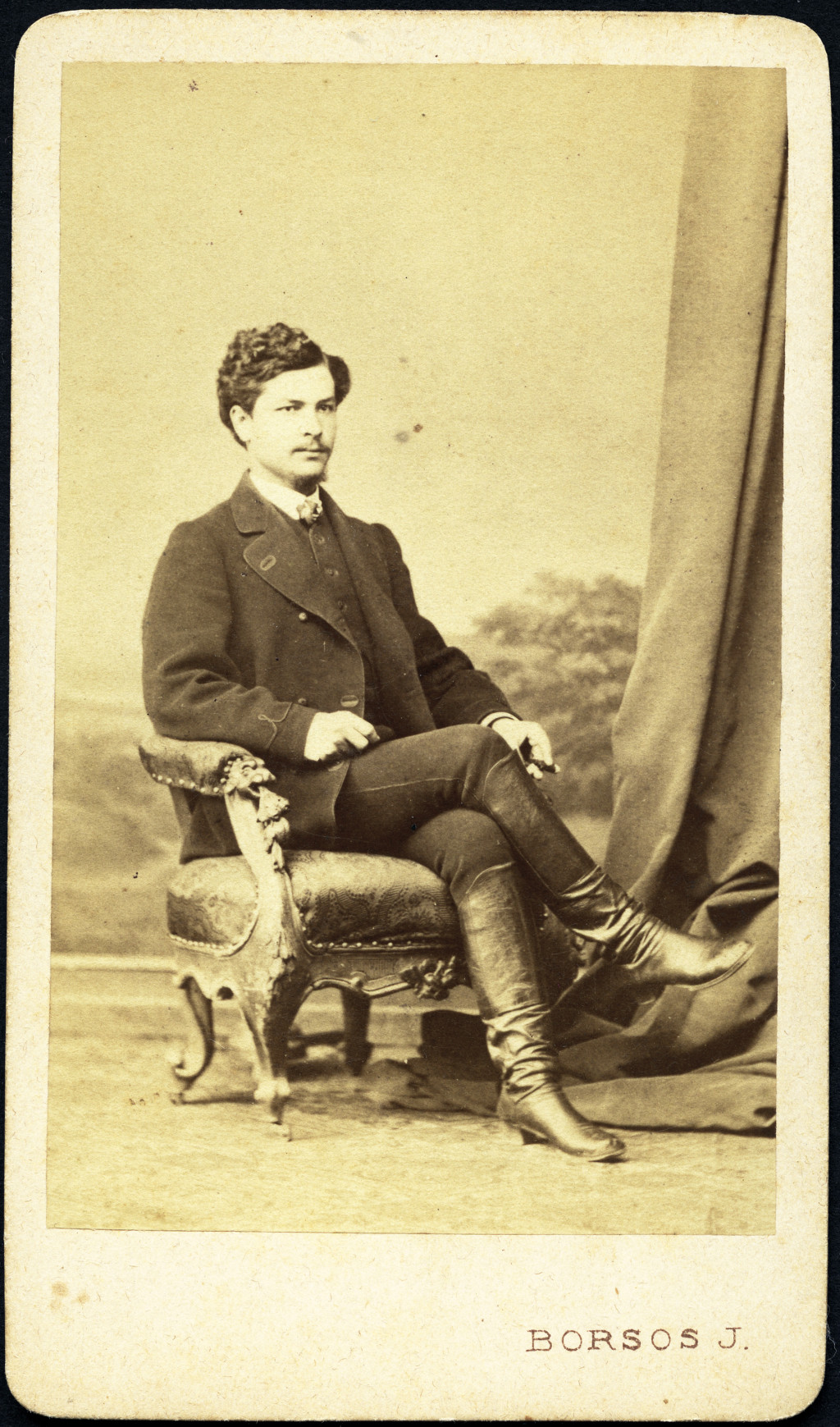 Borsos József műterme, Pest, fiatal férfi szivarral, magyaros ruhába, csizma, monarchia, 1860-as évek, Eredeti CDV, vizitkártya fotó.