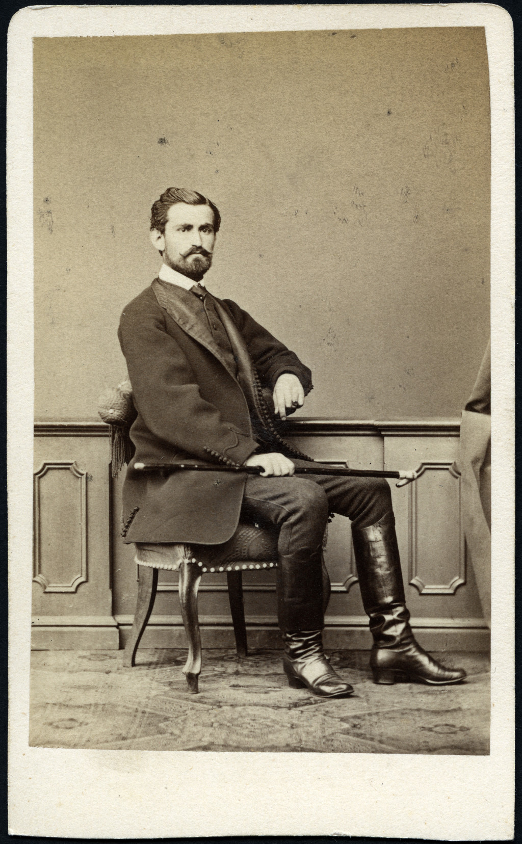Borsos és Doctor műterem, Pest, elegáns szakállas úr csizmában, sétapálcával, monarchia, 1860-as évek, Eredeti CDV, vizitkártya fotó, alja vágott.