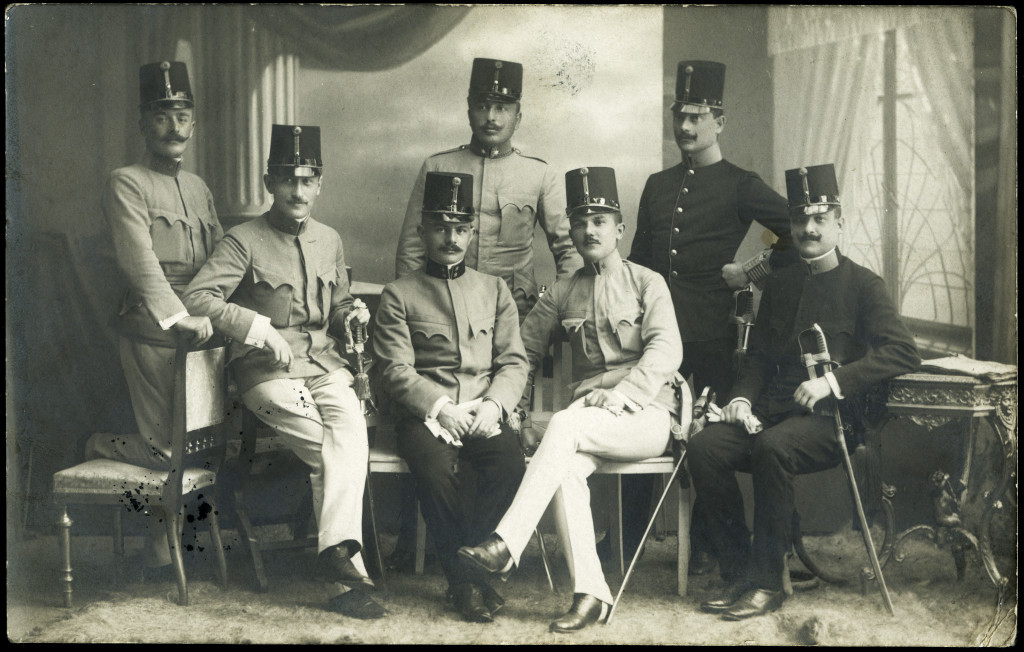 Brauner i Wollner műterem, Károlyváros (Karovac), Horvátország, magyar katonatisztek, kard, egyenruha, bajusz, katona, 1910-es évek, monarchia, Eredeti fotó, hátulján feliratozott papírkép „Károlyváros” postabélyegzővel.