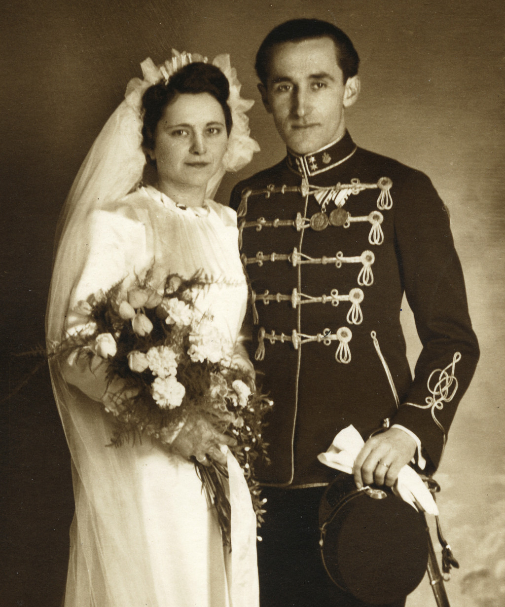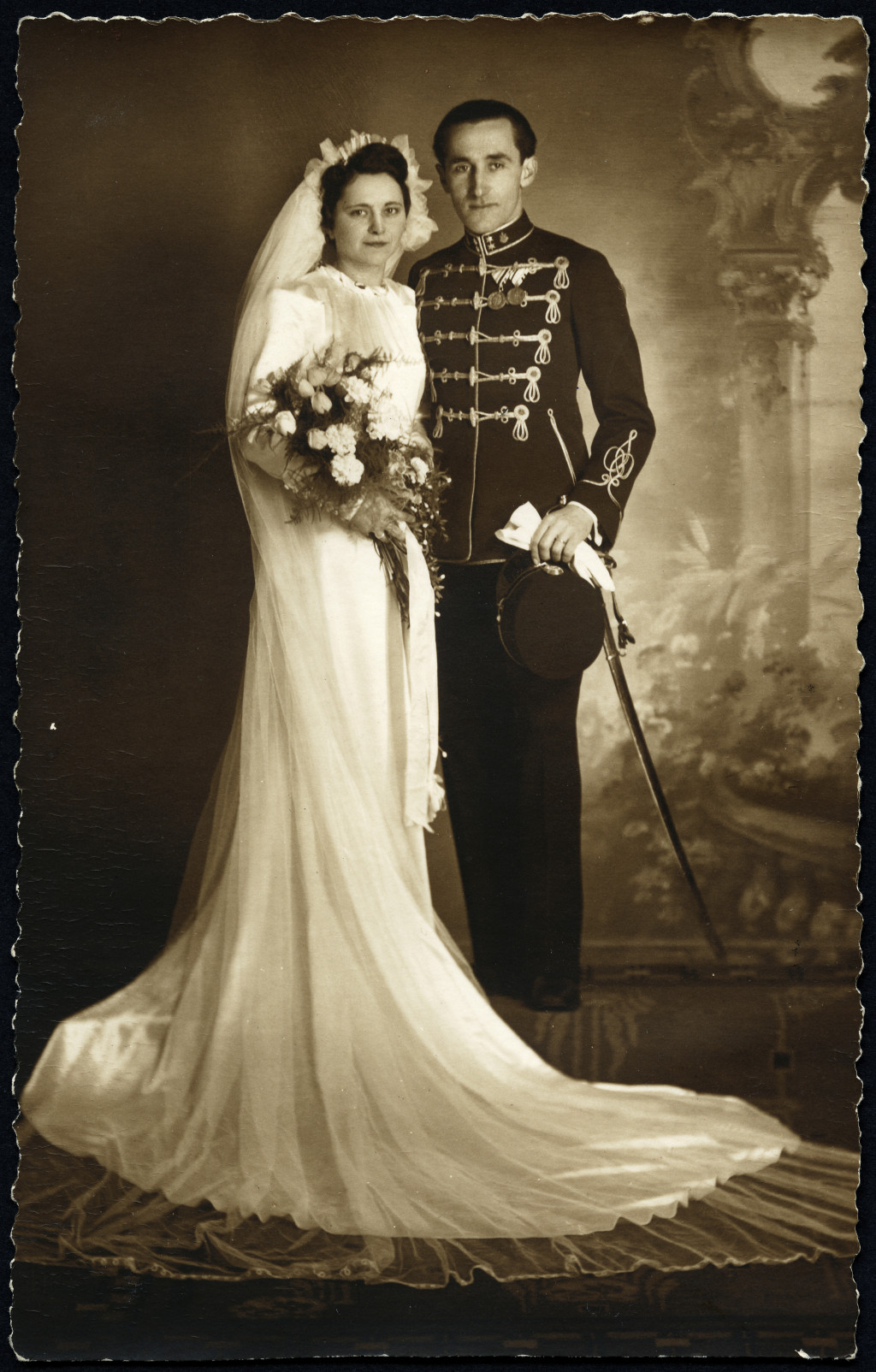 Brunhuber Béla műterme, Budapest, magyar katona esküvője, menyasszony, vőlegény, egyenruha, kard, főhadnagy, műszaki csapat, érdemrend, 2. világháború, 1940-es évek, monarchia, Eredeti fotó, papírkép.