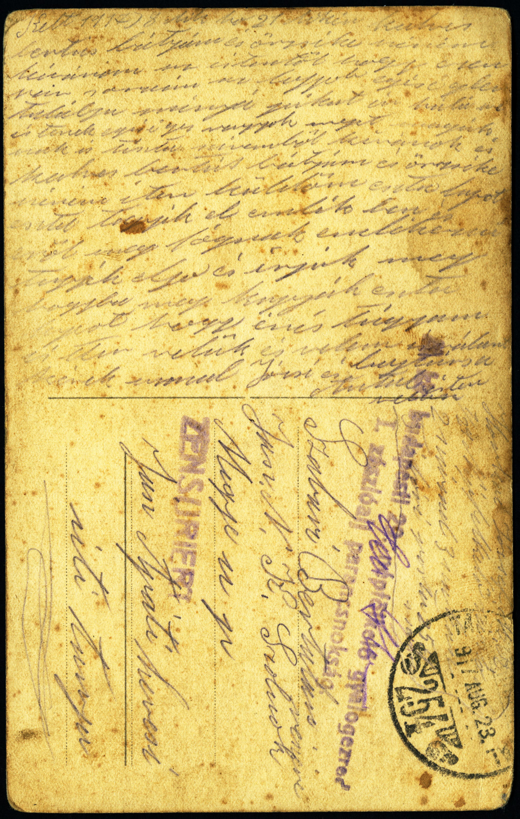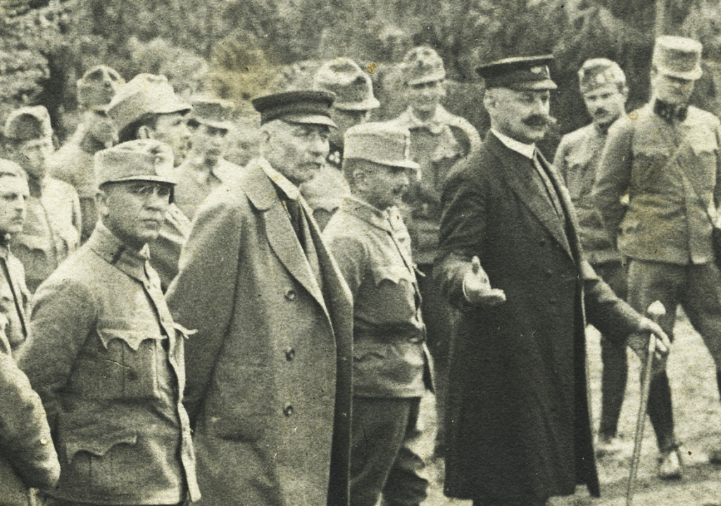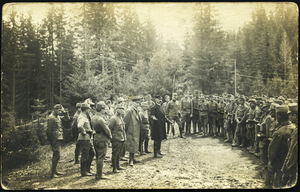 „Budapesti 29. népfölkelő gyalogezred 1. zászlóalj parancsnokság”, katonai vezetők eligazítást tartanak, 1. világháború, egyenruha, monarchia, 1917, 1910-es évek, Eredeti fotó, hátulján feliratozott papírkép, tábori posta.