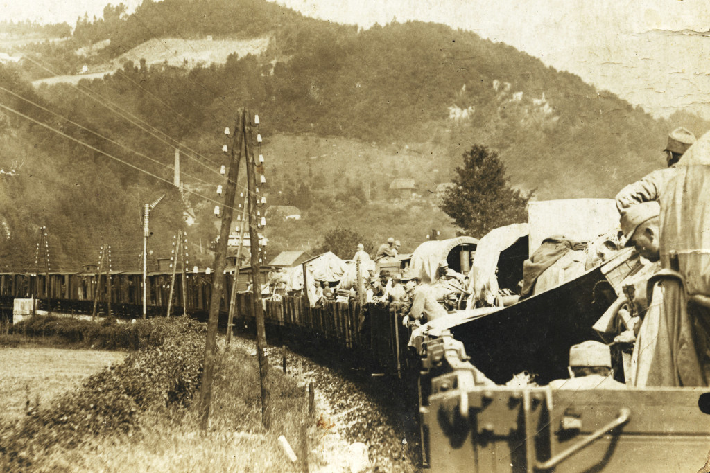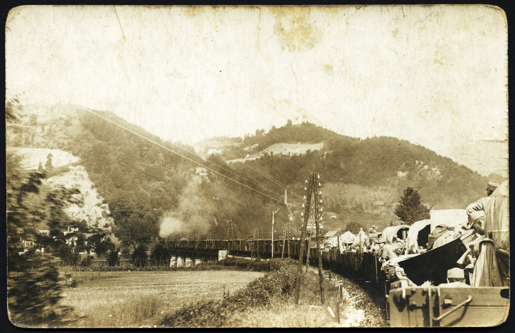 „Csapatszállítás a frontra Ivangorod”, magyar katonák szállítása tehervonaton, 1. világháború, egyenruha, jármű, közlekedés, vasút, monarchia, 1910-es évek, Eredeti fotó, hátulján feliratozott papírkép.