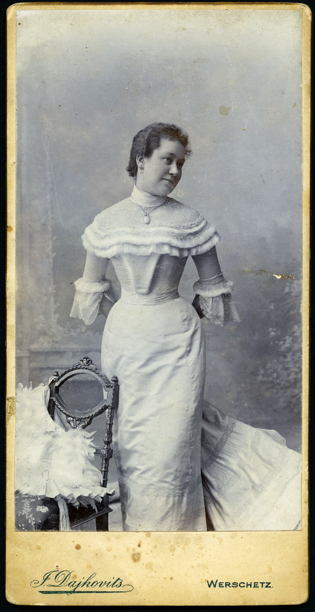 Dajkovits műterem, Werschetz (Versec), Vajdaság, elegáns nő székkel, gyönyörű ruhában, monarchia, 1890-es évek, Eredeti kabinetfotó ritka német helymegjelöléssel.
