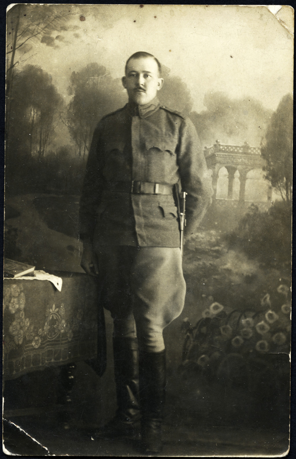 Fiatal magyar férfi román egyenruhában, Gyergyóújfalu, Erdély, Székelyföld, katona, bajonett, 1921, 1920-as évek, Horthy-korszak, Eredeti fotó, hátulján feliratozott papírkép.