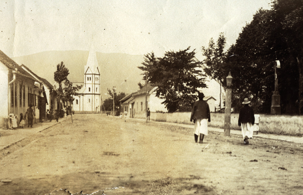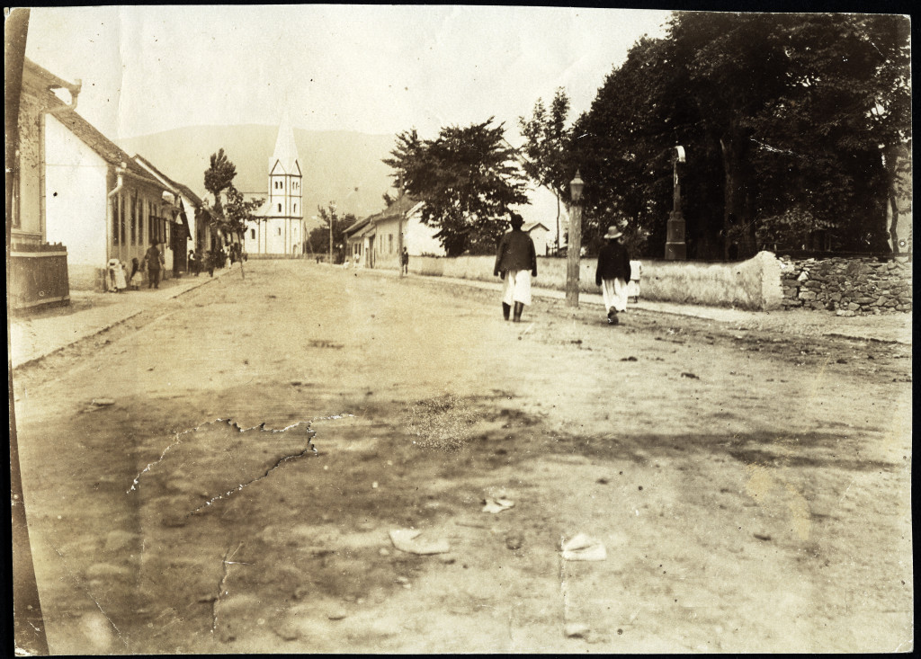 Főutca ruszin parasztokkal, Szolyva, Kárpátalja, templom, 1900-as évek, monarchia, helytörténet, Eredeti fotó, papírkép, középen szakadás, hátulja foltos.