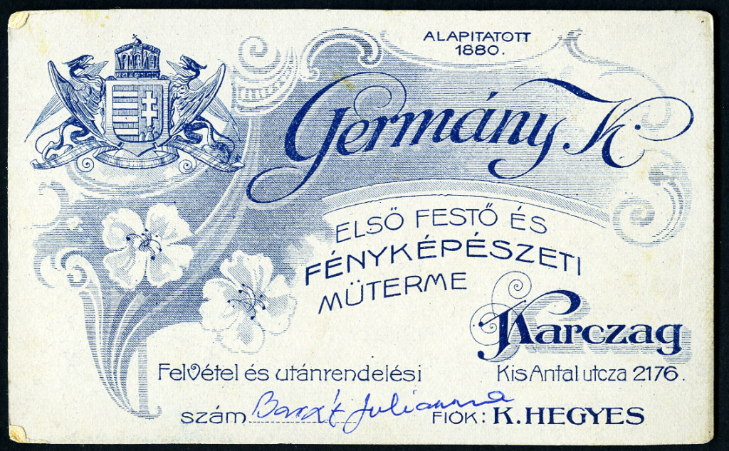 Germány műterem, Karcag, elegáns nő portréja, gyönyörű ruha, monarchia, Jász-Nagykun-Szolnok megye, helytörténet, 1890-es évek, Eredeti CDV, vizitkártya fotó.