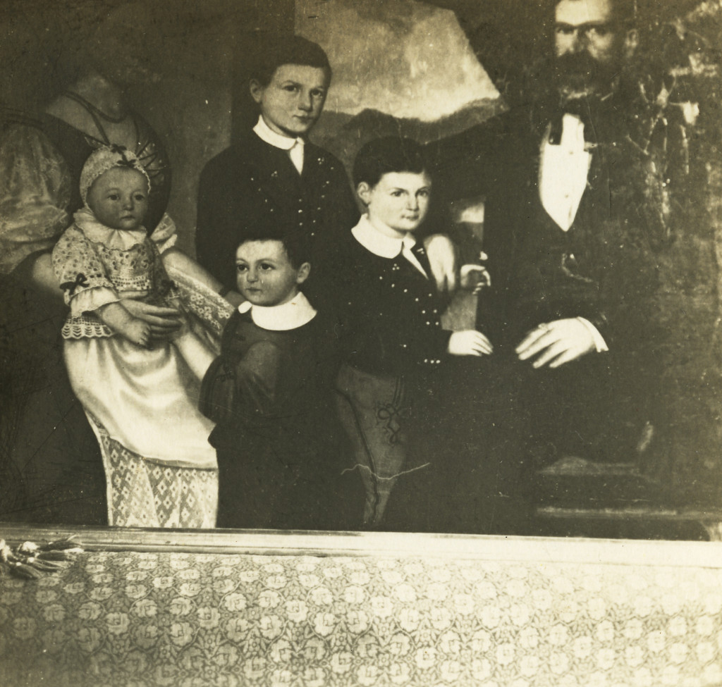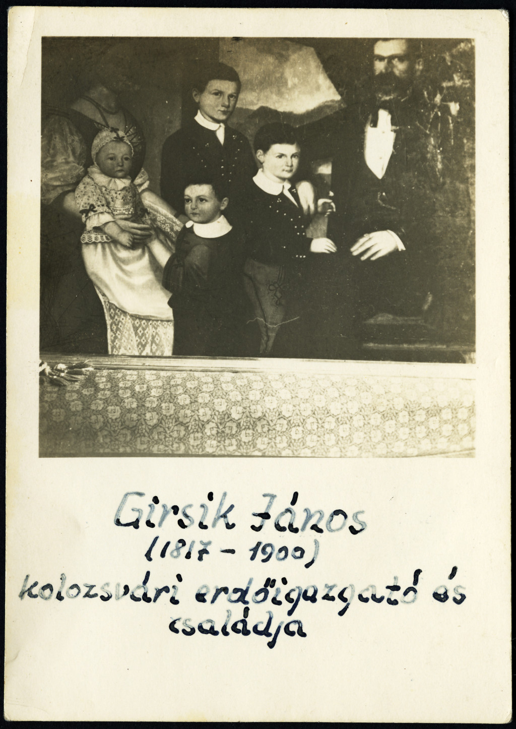 Girsik János kolozsvári erdőigazgató és családja, Erdély, egy olajfestmény feliratozott fotója, 1930-as évek, Horthy-korszak, Eredeti fotó, feliratozott papírkép.
