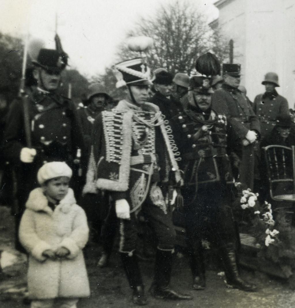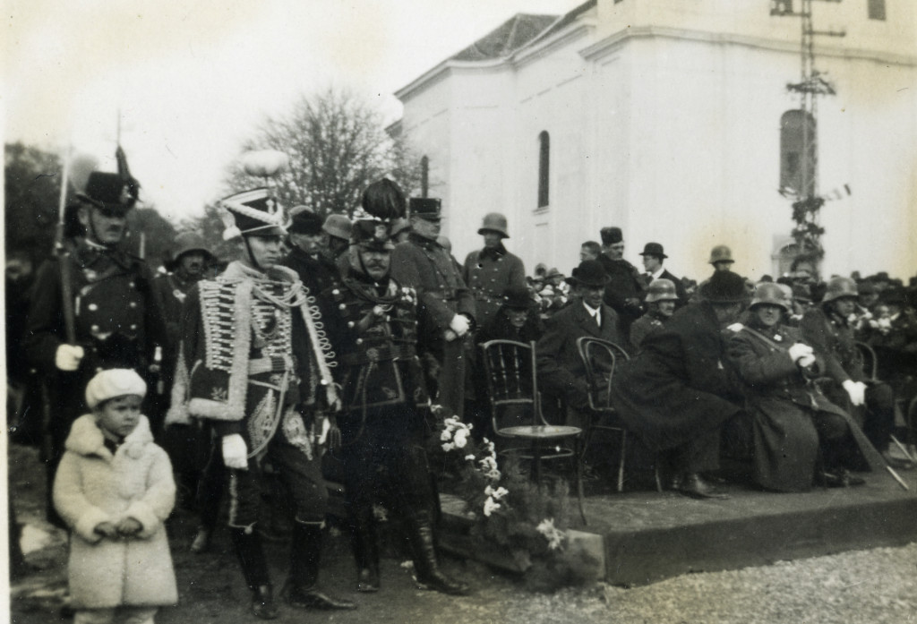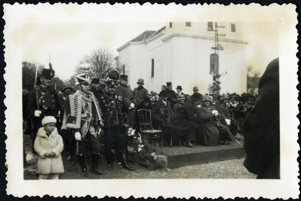 Hősi Emlékmű avatása, Kisbér, főtiszt, főnemes, csendőrtiszt, díszegyenruha, katona, ünnep, egyenruha, Horthy-korszak, 1933. 11. 01., 1930-as évek, Eredeti fotó, papírkép, hátulján ragasztásnyomok.