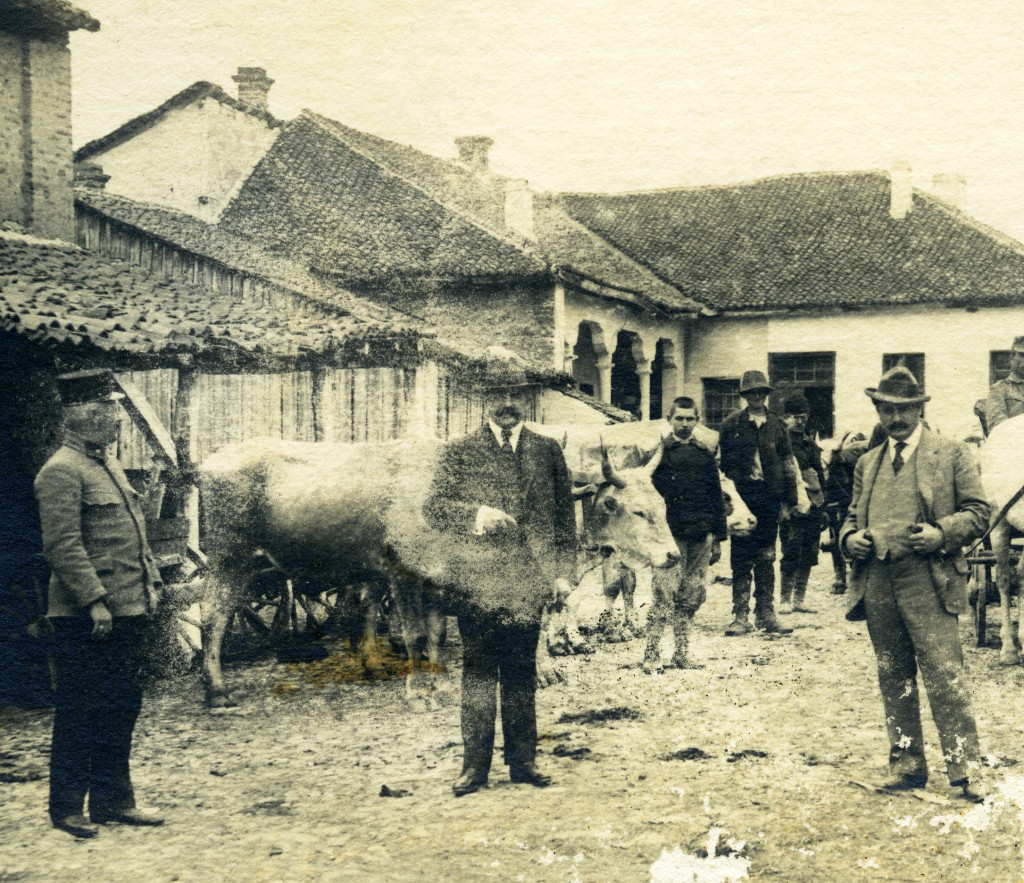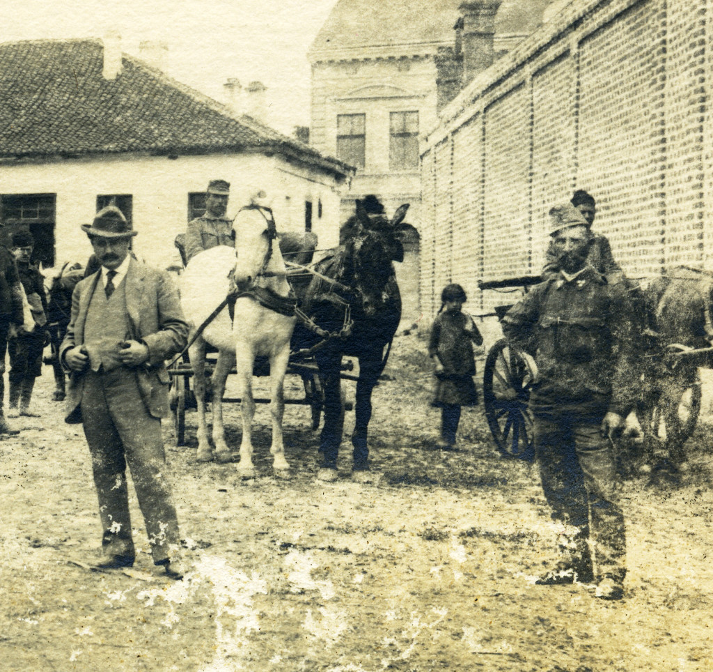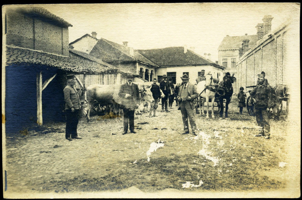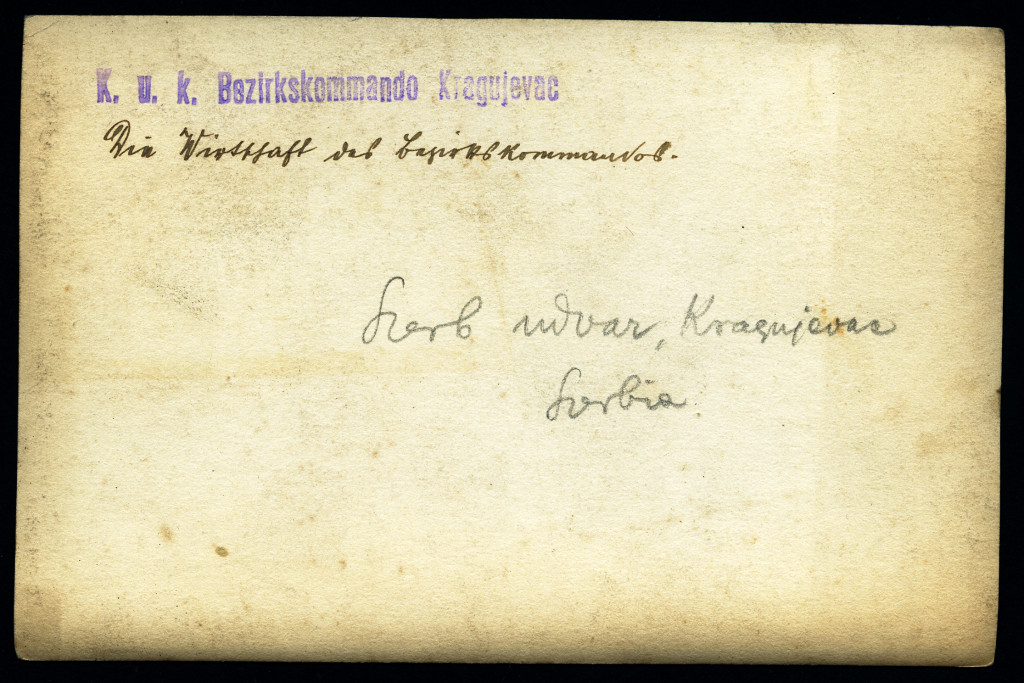 K.u.K. Bezirkskommando, Kragujevac, Szerbia, kerületi parancsnokság, magyar katonák egy szerb udvaron, 1. világháború, egyenruha, 1910-es évek, monarchia, Eredeti fotó, hátulján feliratozott, pecséttel jelzett papírkép, felületén kopásnyomok.