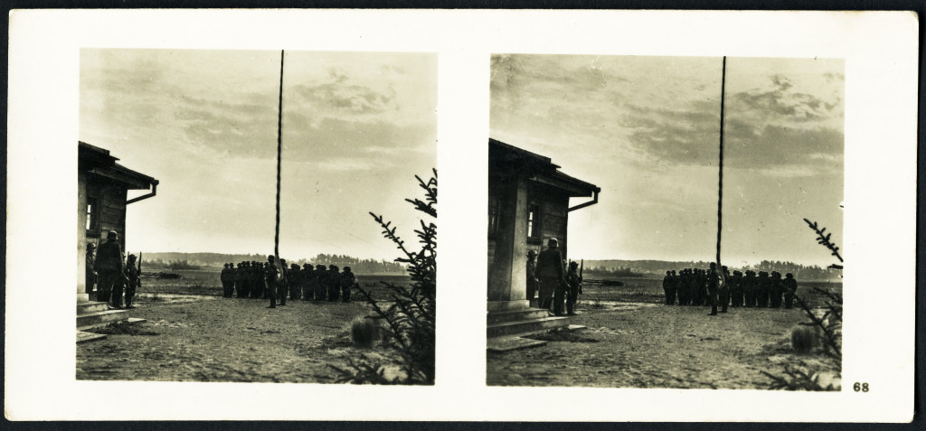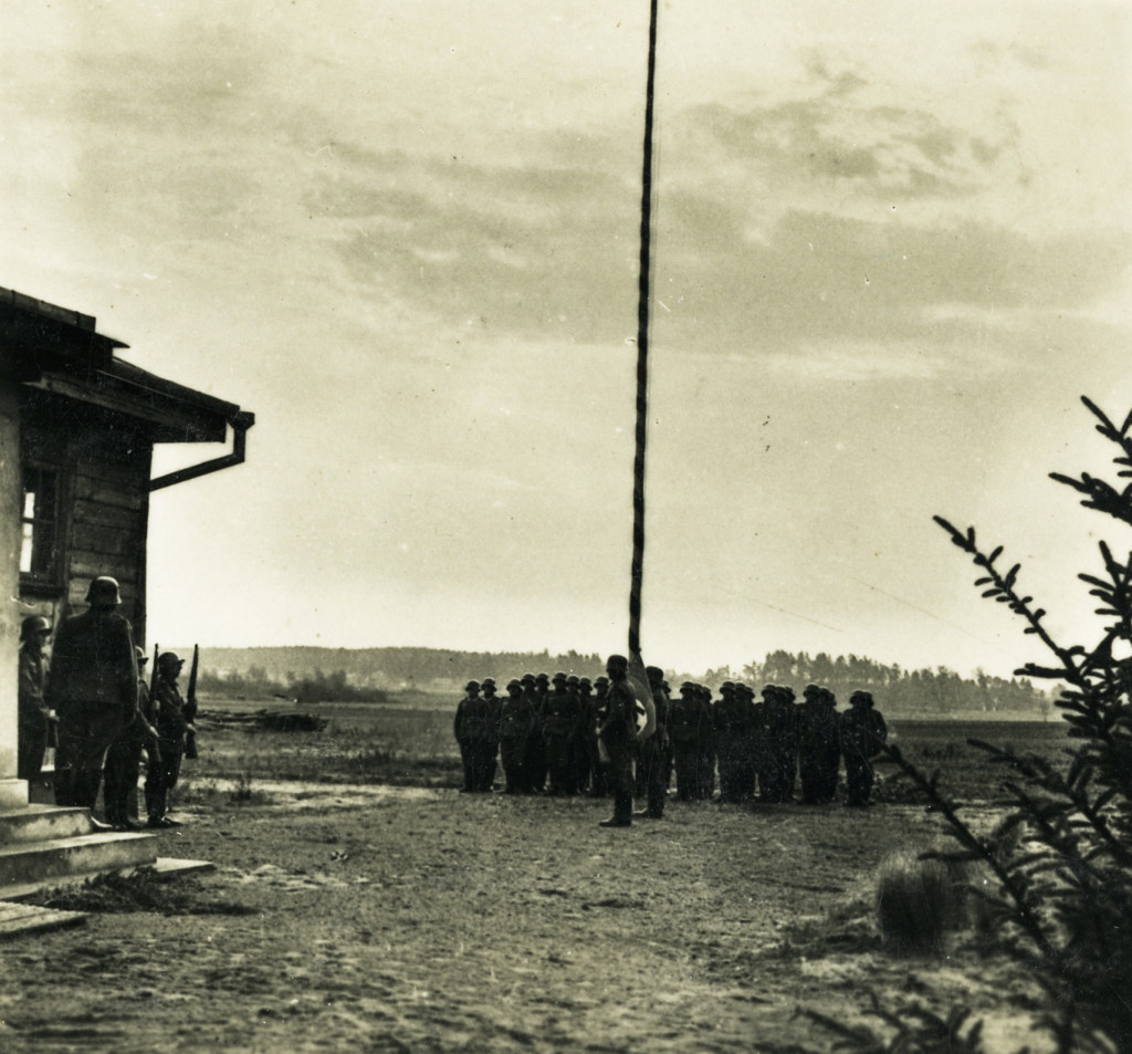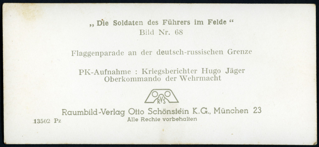 Katonai zászlófelvonás a német-szovjet határon, Lengyelország, horogkeresztes zászló, náci egyenruha, 2. világháború, Horthy-korszak, 1939, 1930-as évek, Eredeti sztereó fotó, hátulján feliratozott gyűjteményes papírkép.