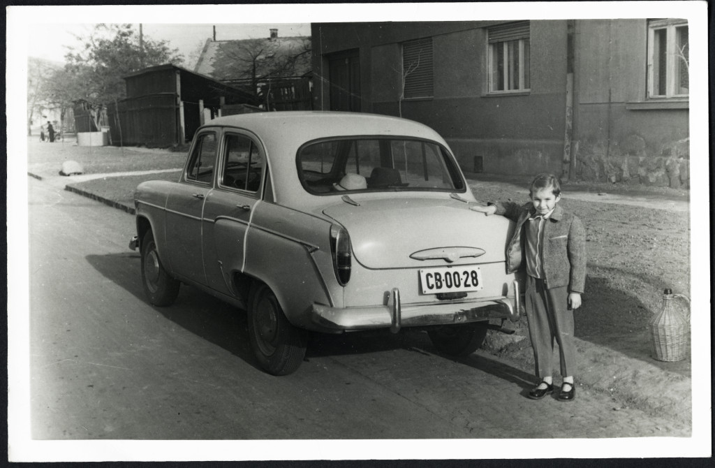 Kisfiú Moszkvics személygépkocsival, Gyöngyös, jármű, közlekedés, autó, helytörténet, szocializmus, 1961, 1960-as évek, Eredeti fotó, hátulján feliratozott papírkép.