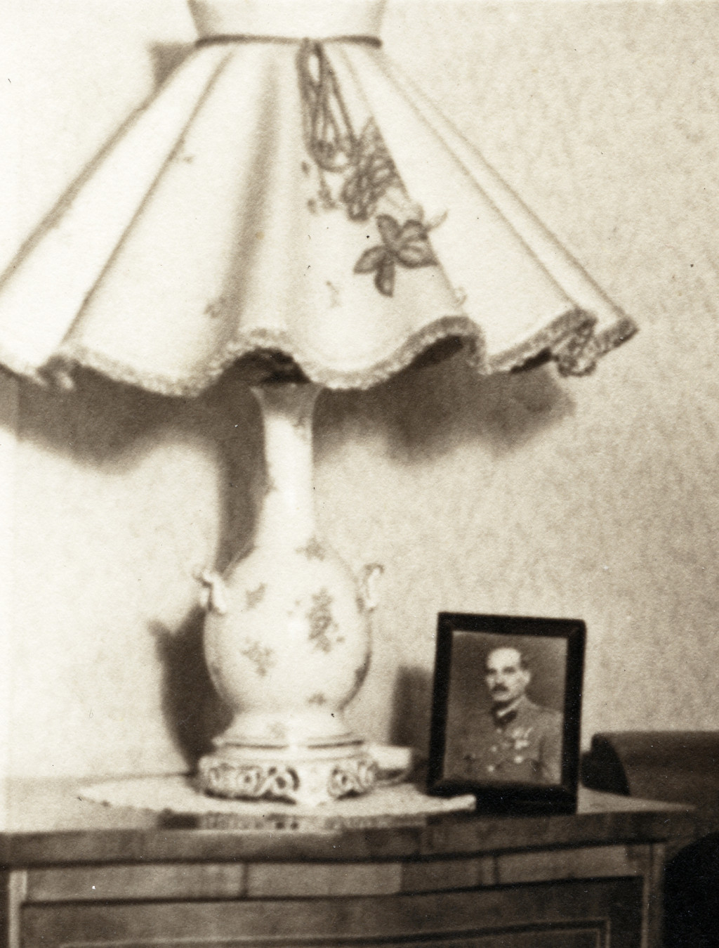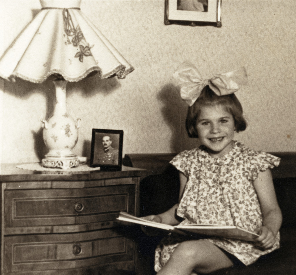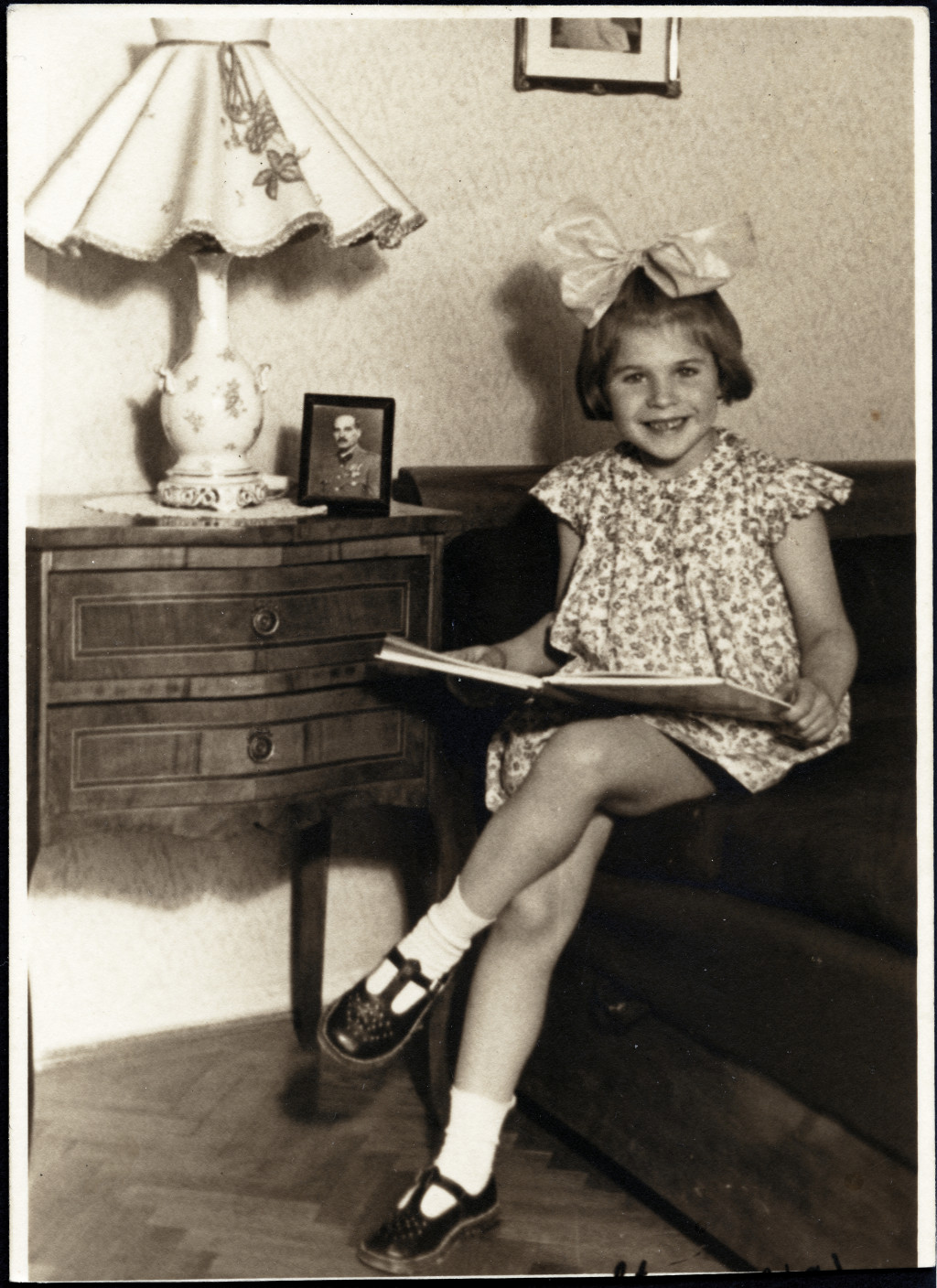Kislány katona apukájának fényképével, masni, lakásbelső, egyenruha, gyerek, 2. világháború, Horthy-korszak, 1940-es évek, Eredeti fotó, papírkép.