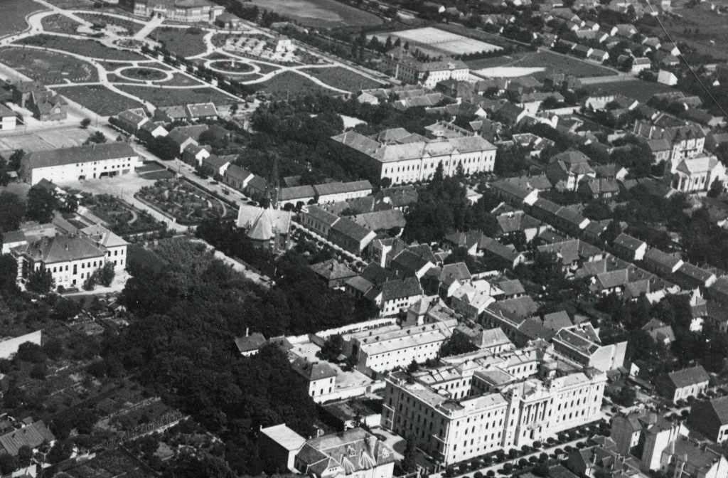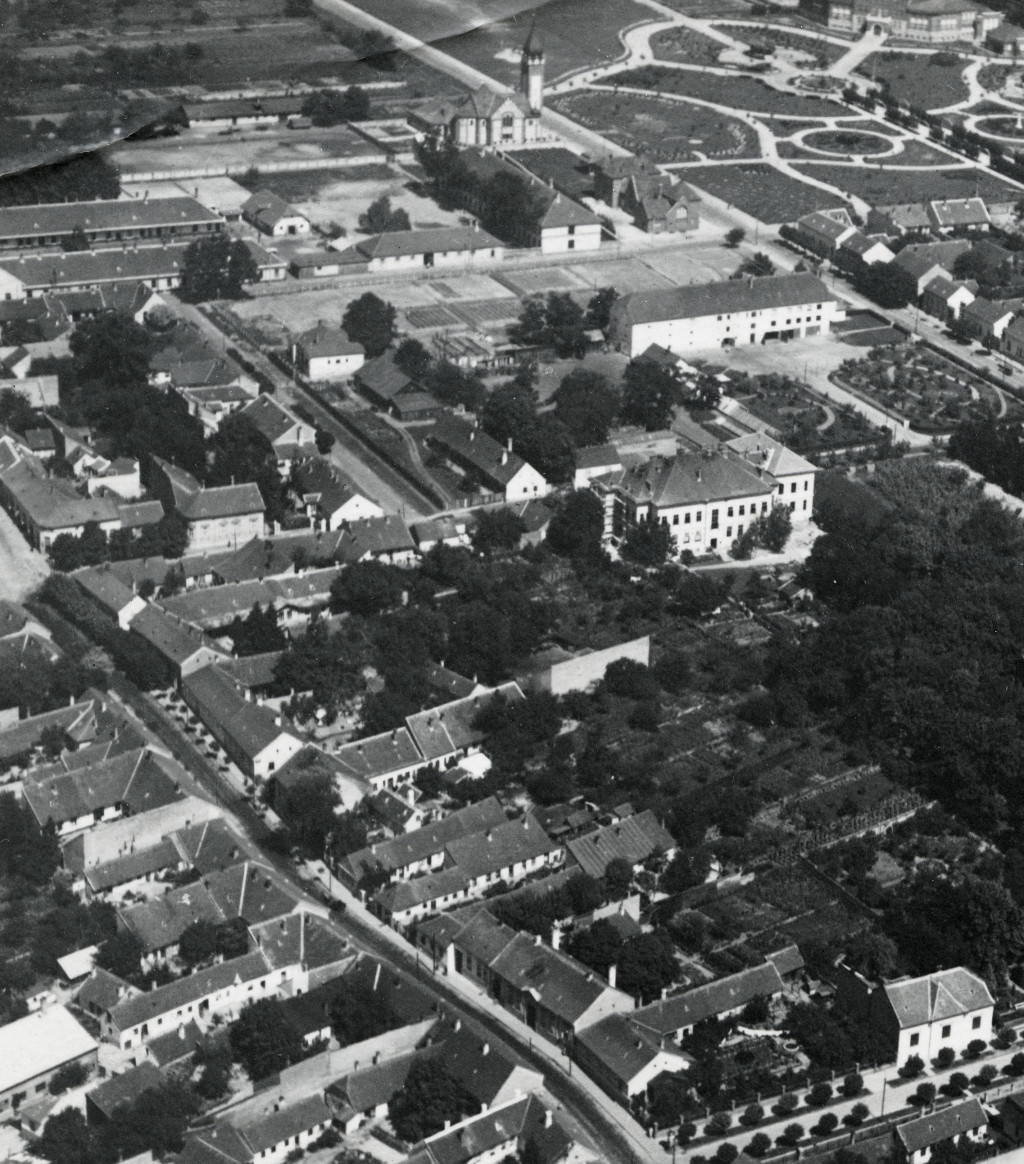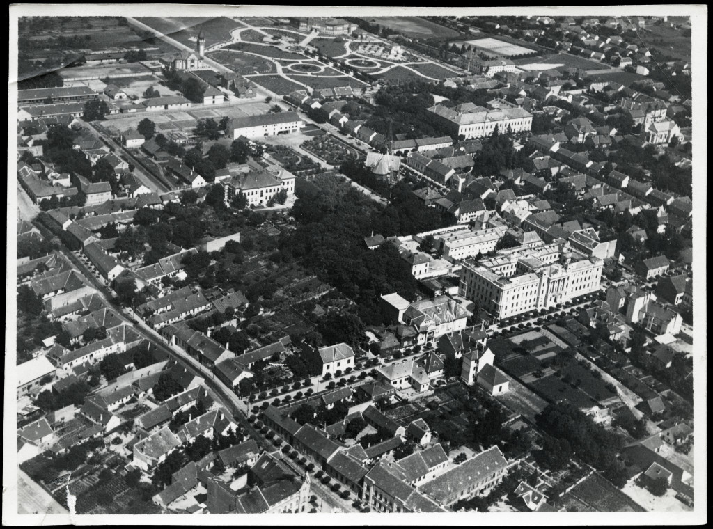 Légi felvétel, Kaposvár, Kaposvár látképe repülőről, Magyar Királyi Légügyi Hivatal, 1936, 1930-as évek, Horthy-korszak, Eredeti fotó, hátulján feliratozott, pecséttel jelzett papírkép.