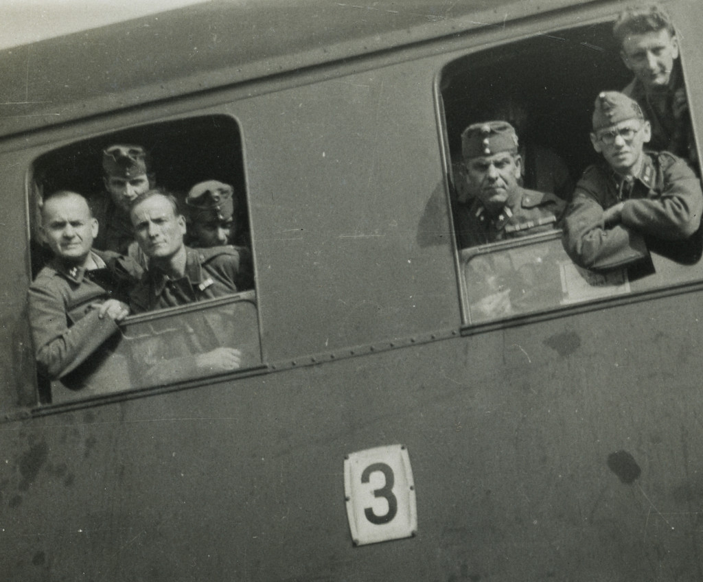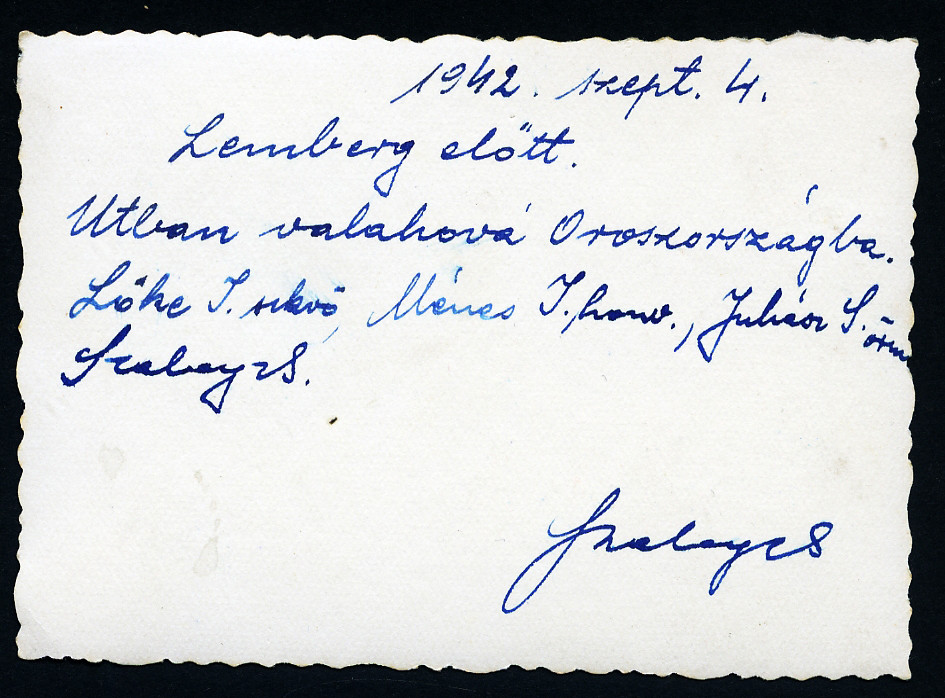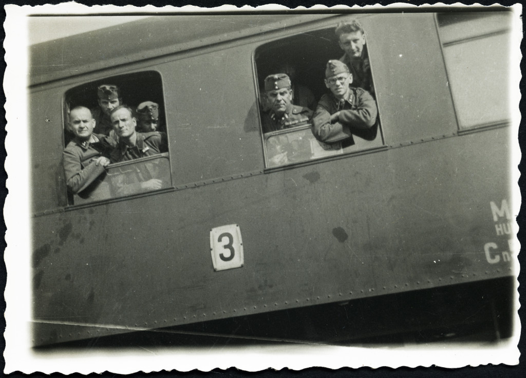 „Lemberg előtt”. Magyar katonák vonaton, Szalay Sándor, honvéd, kitüntetés, katona, egyenruha, jármű, közlekedés, 2. világháború, Horthy-korszak, 1942, 1940-es évek, Eredeti fotó, hátulján feliratozott papírkép.