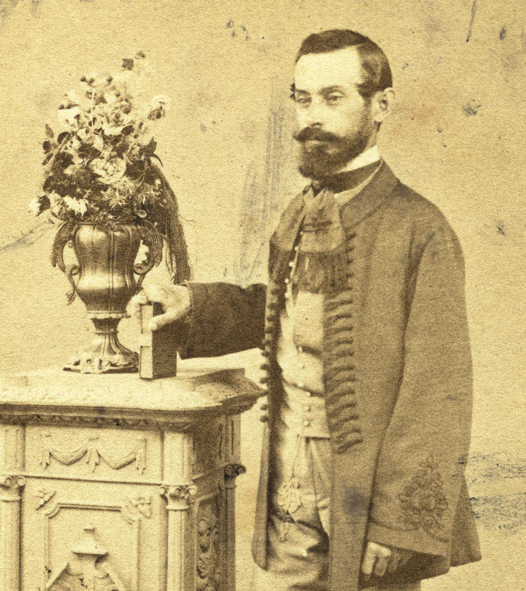 Louis Henri műterme, Pozsony, Felvidék, elegáns szakállas férfi magyaros ruhában, csizmában, monarchia, 1860-as évek, Eredeti CDV, vizitkártya fotó.