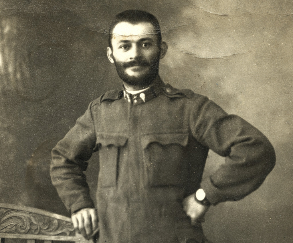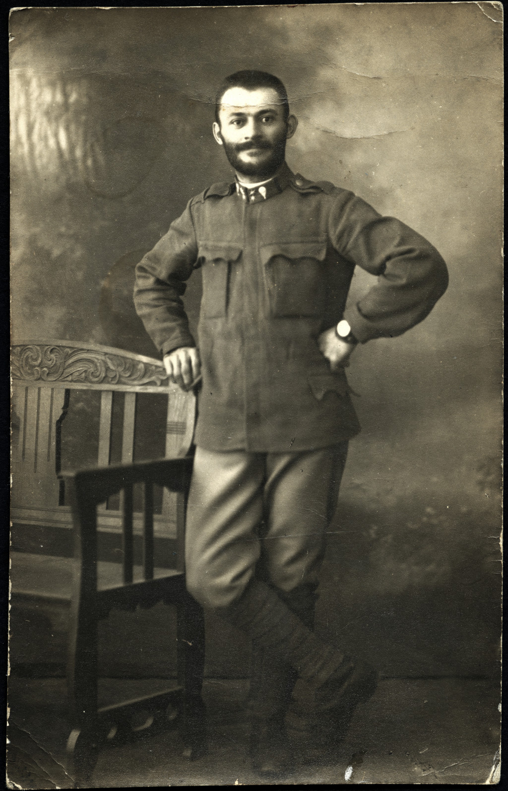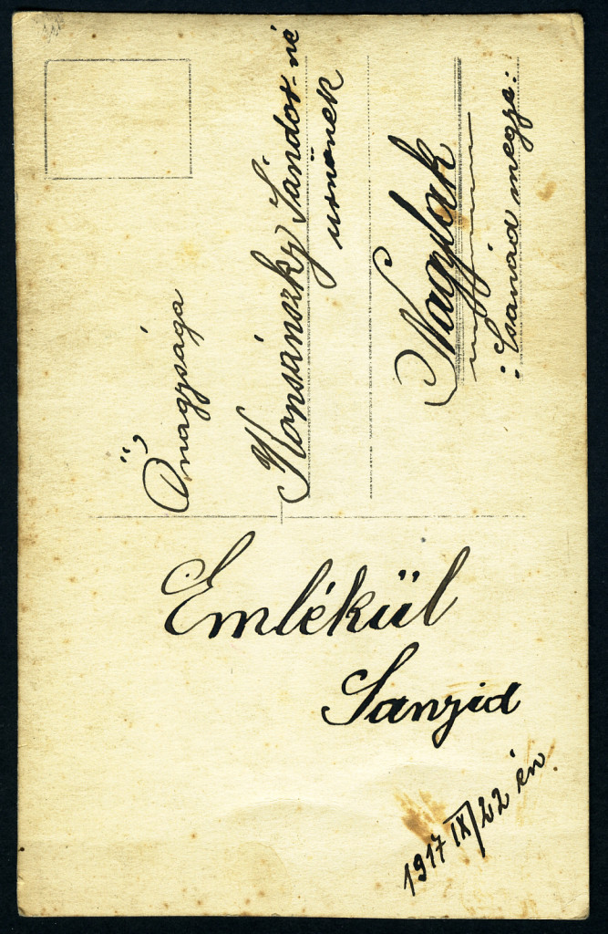 Császári és Királyi légierő, magyar katona karórával, egyenruhában, légjáró csapat tizedes, , szakáll, Nagylakra (Erdély), Konsánszky Sándorné úrnőnek címezve, 1. világháború, 1917, 1910-es évek, monarchia, Eredeti fotó, hátulján feliratozott papírké