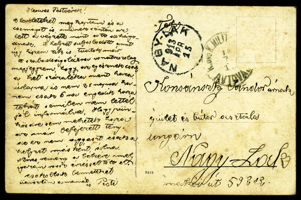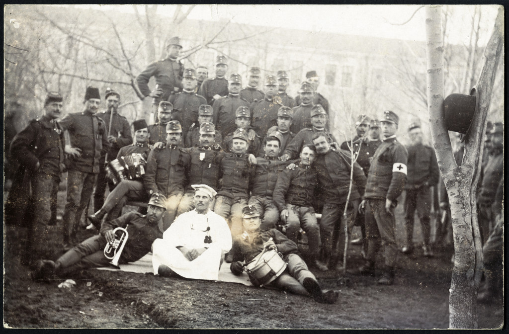 Magyar katonák egy katonai kórházban, egyebruha, hangszerek, 1. világháború előtt, monarchia, Eredeti fotó, hátulján feliratozott papírkép, Nagylakra címezve.