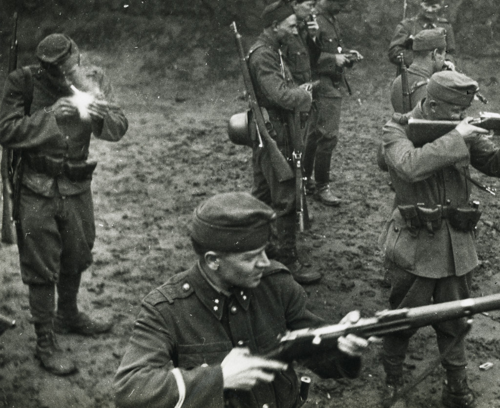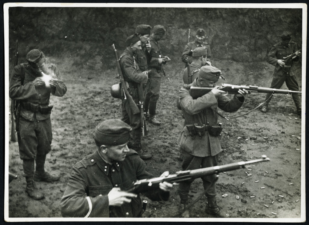 Magyar katonák lőgyakorlaton, ismétlőpuska, egyenruha, fegyver, 2. világháború, 1940-es évek, Horthy-korszak, Eredeti fotó, papírkép.