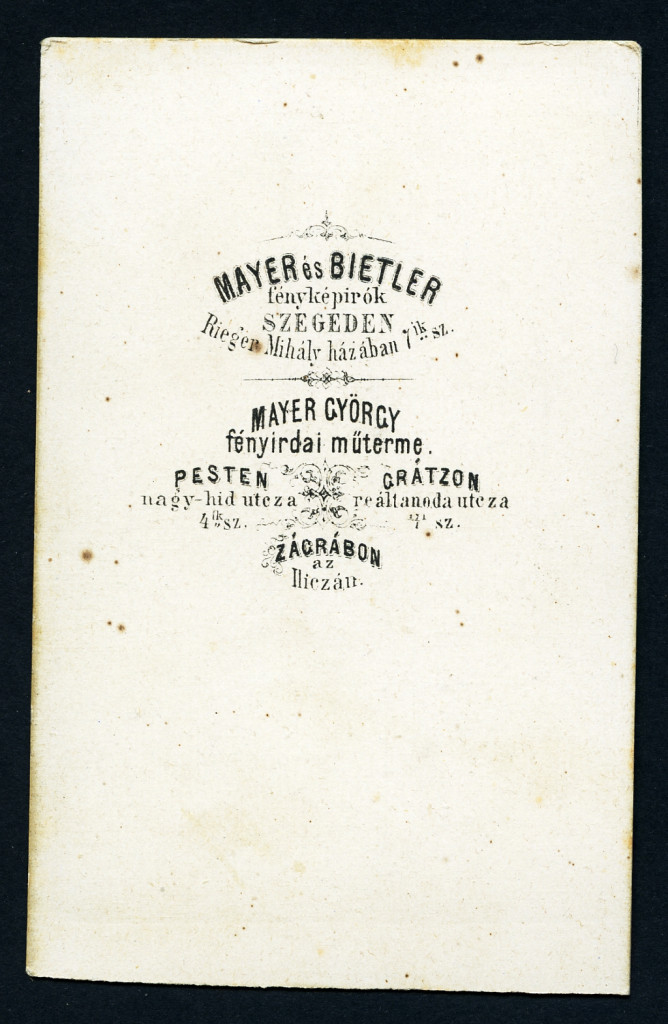 Mayer és Bietler fényképírók műterme, Szeged, elegéns fiú magyaros ruhában, ritka műterem, helytörténet, monarchia, 1860-as évek, Eredeti CDV, vizitkártya fotó.