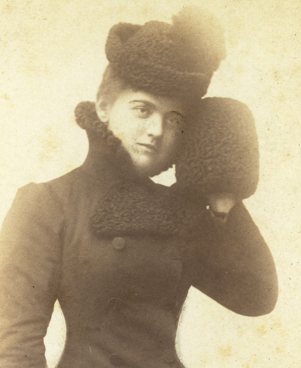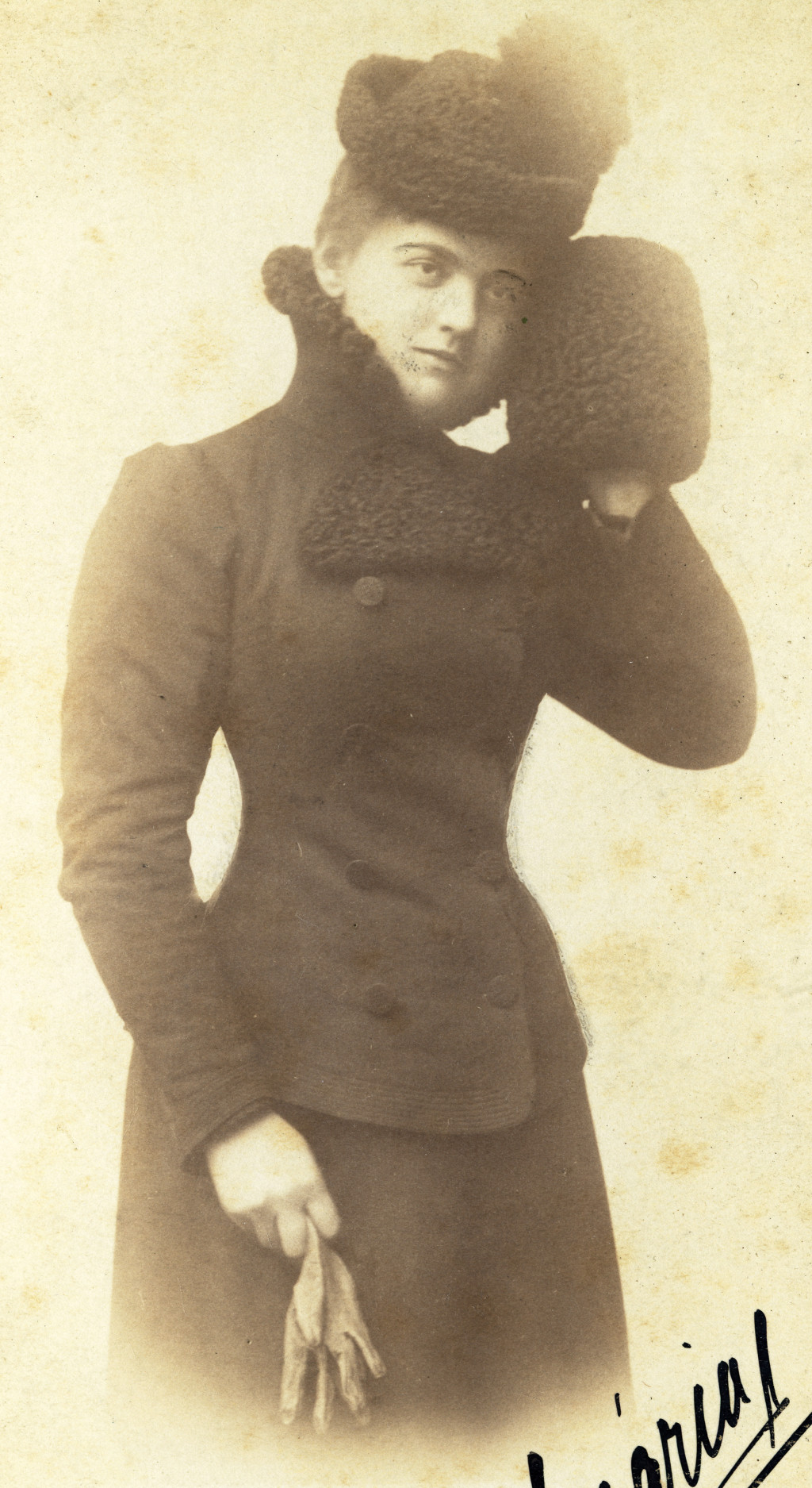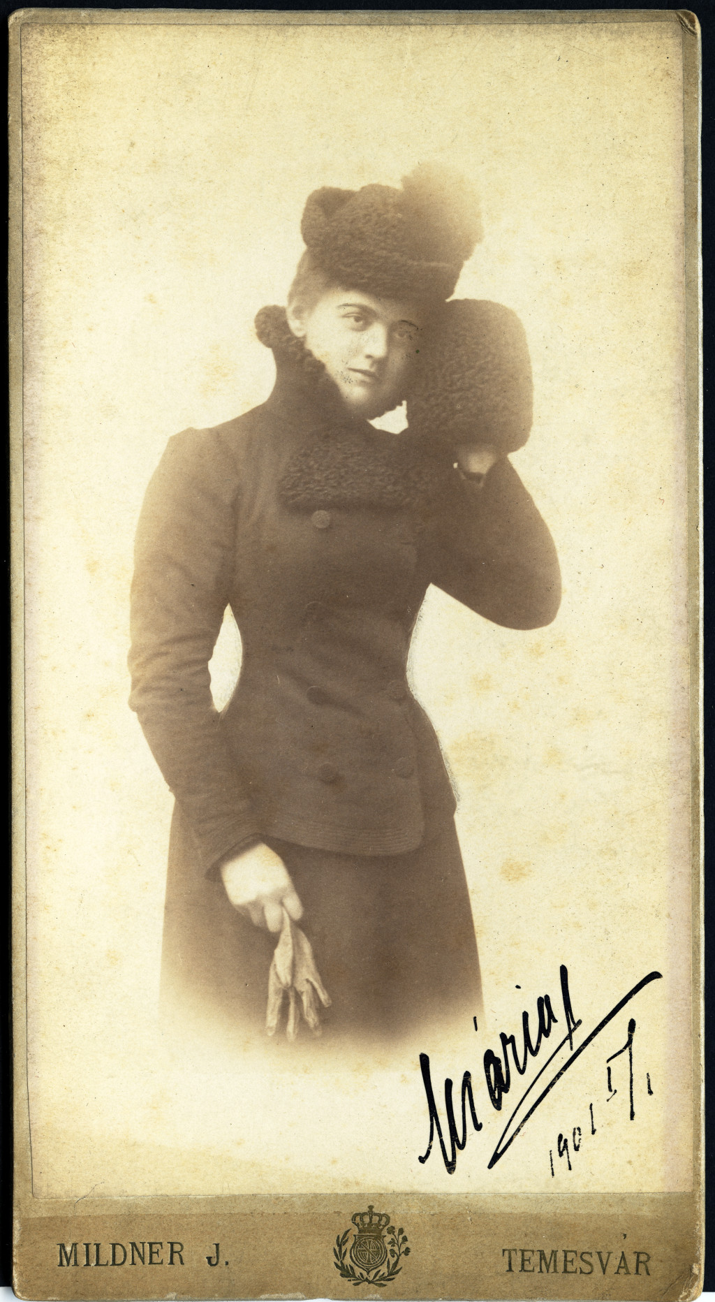 Nagyobb méret, Mildner J. műterme, Temesvár, Erdély, elegáns nő, Mária, télikabát, kalap, muff, kesztyű, divat, monarchia, 1890-es évek, Eredeti, aláírt kabinetfotó.
