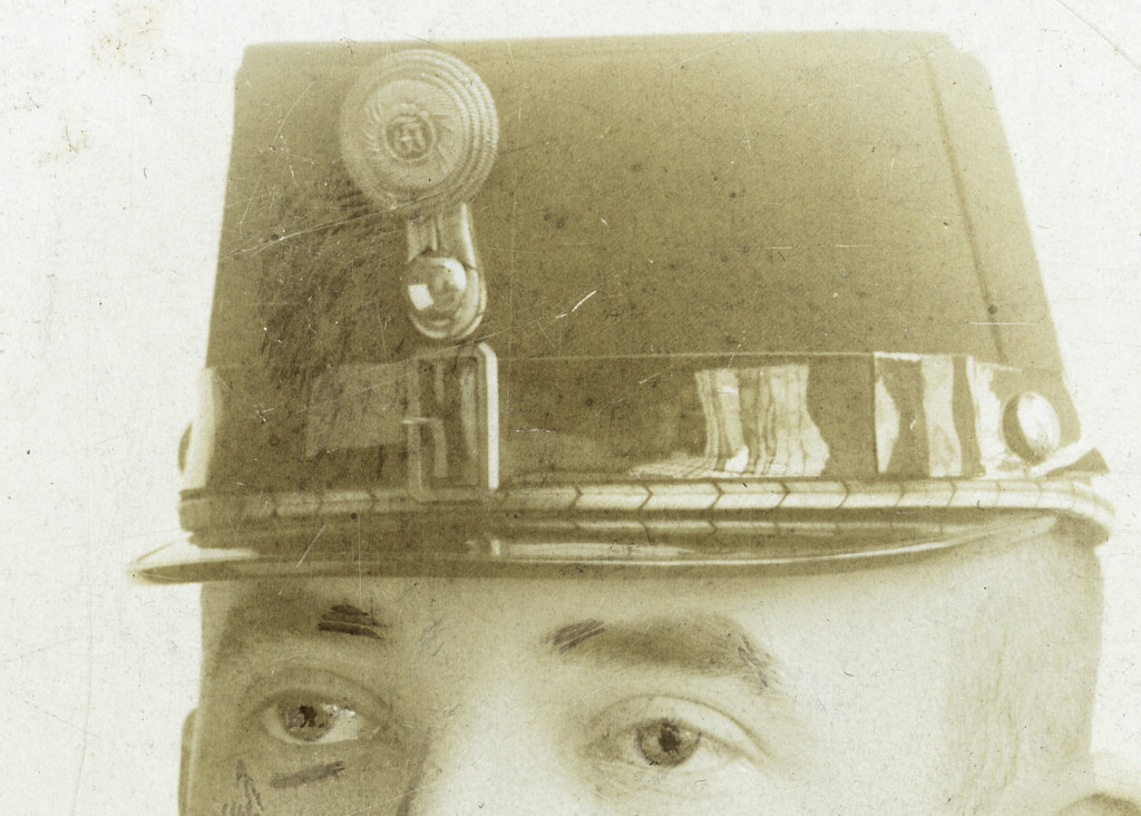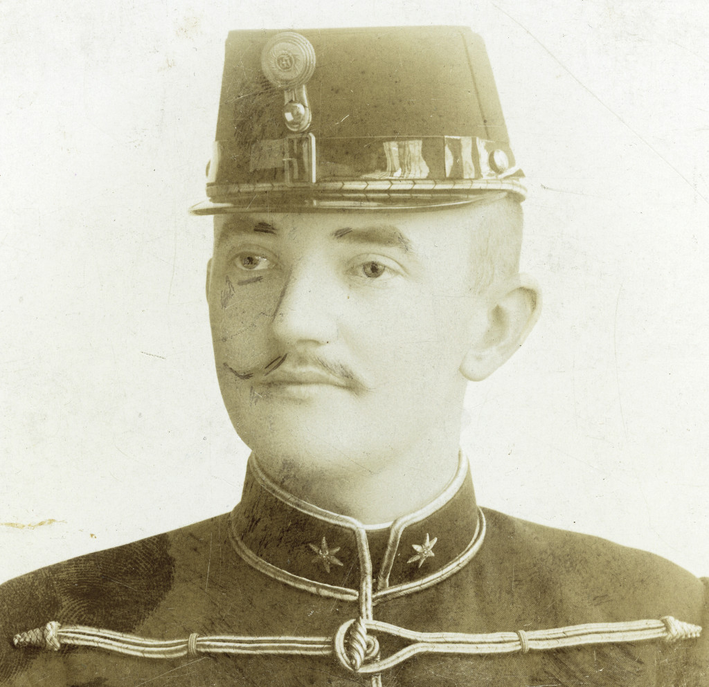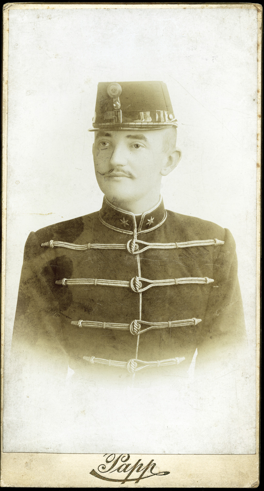 Nagyobb méret, Papp műterem, magyar katona huszár egyenruhában, sapkajelvény, retusált bajusz, helytörténet, monarchia, 1890-es évek, Eredeti kabinetfotó.