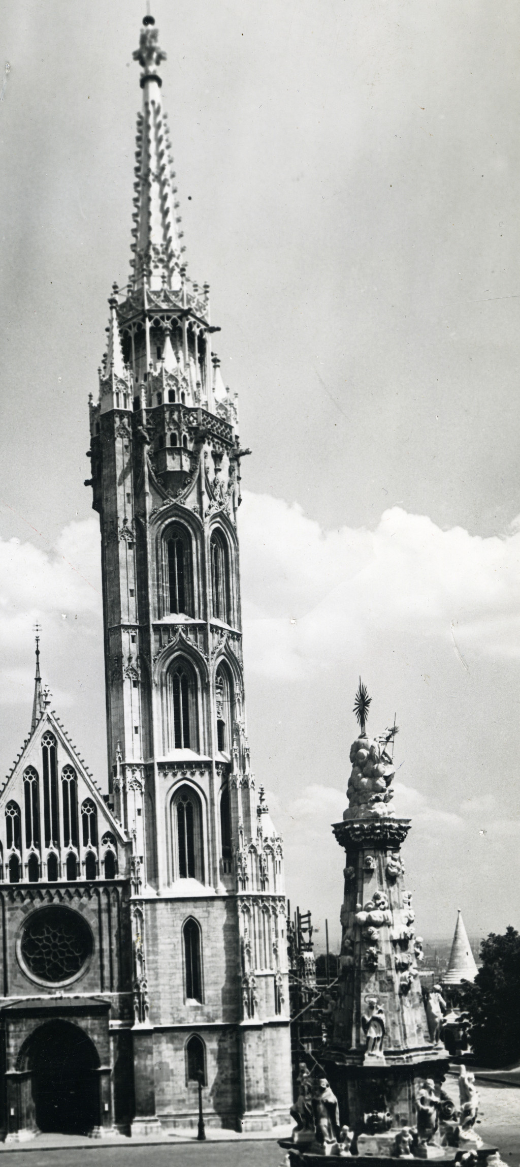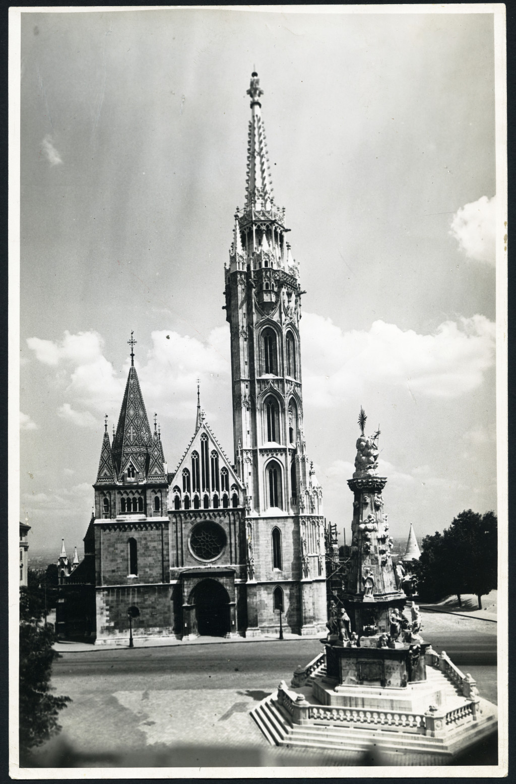 Nagyobb méret, Vadas Ernő fotóművész jelzett fotója, Budapest, Mátyás templom, Szentháromság szobor, 1. kerület, budai Vár, helytörténet, Horthy-korszak 1930-as évek, Eredeti fotó, hátulján feliratozott pecséttel jelzett papírkép.