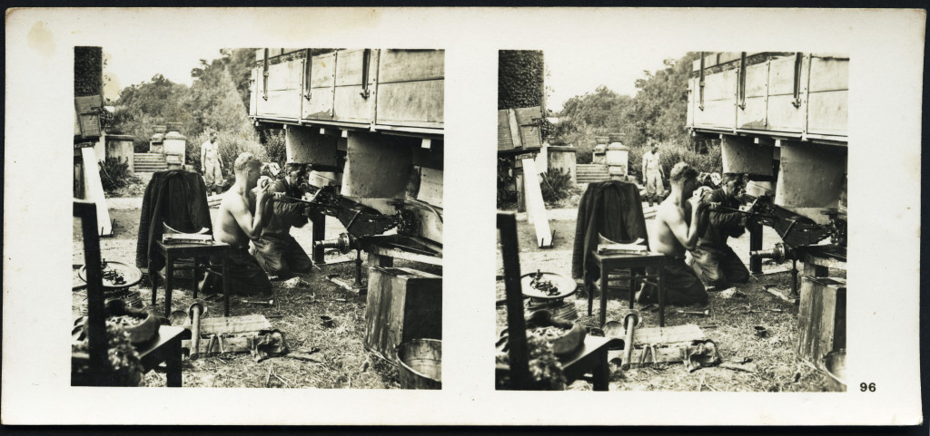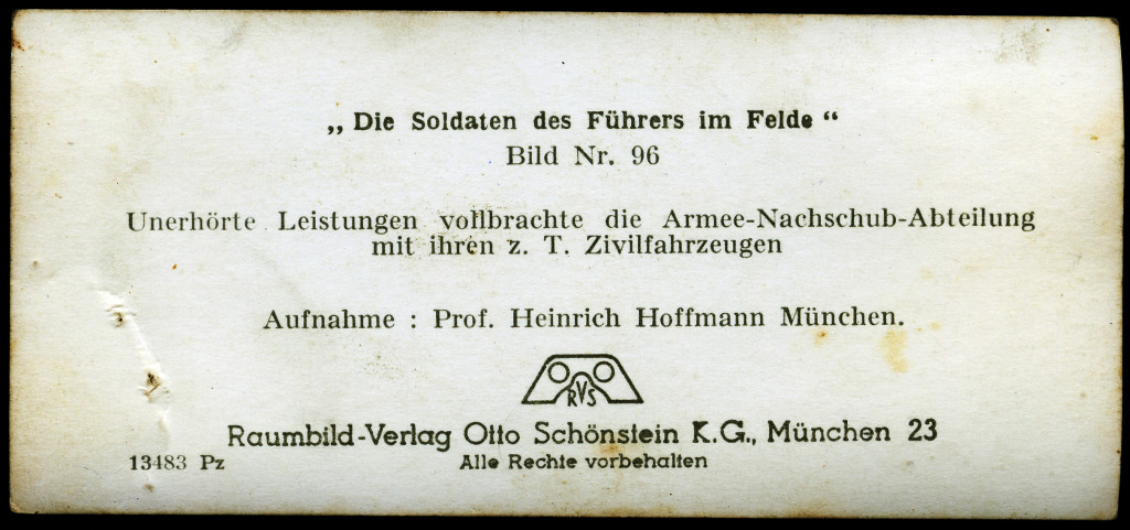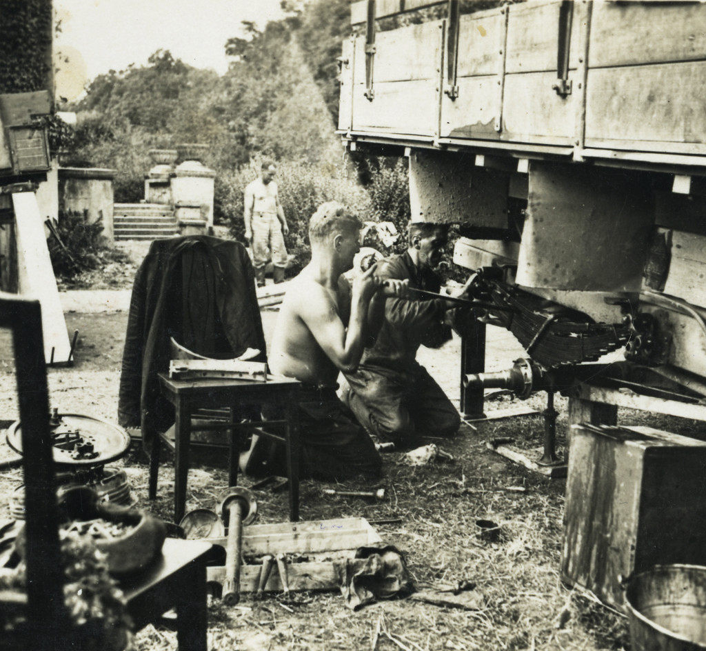 Német katonák teherautót javítanak, Lengyelország, az utánpótlási vonalakon civil járműveket is használnak, egyenruha, 2. világháború, Horthy-korszak, 1939, 1930-as évek, Eredeti sztereó fotó, hátulján feliratozott gyűjteményes papírkép.