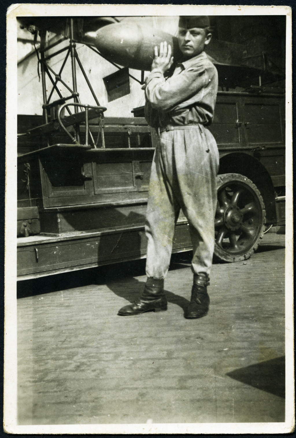Repülő-műszaki katona szerelő kezeslábasban, Magyarország, légi bomba, katona, egyenruha, 2. világháború, Horthy-korszak, 1940-es évek, Eredeti fotó, papírkép.