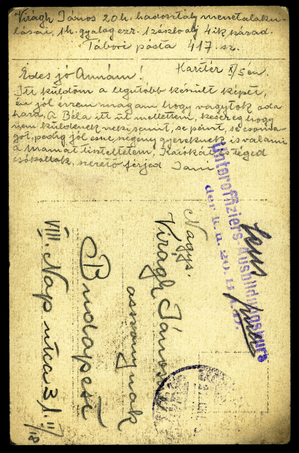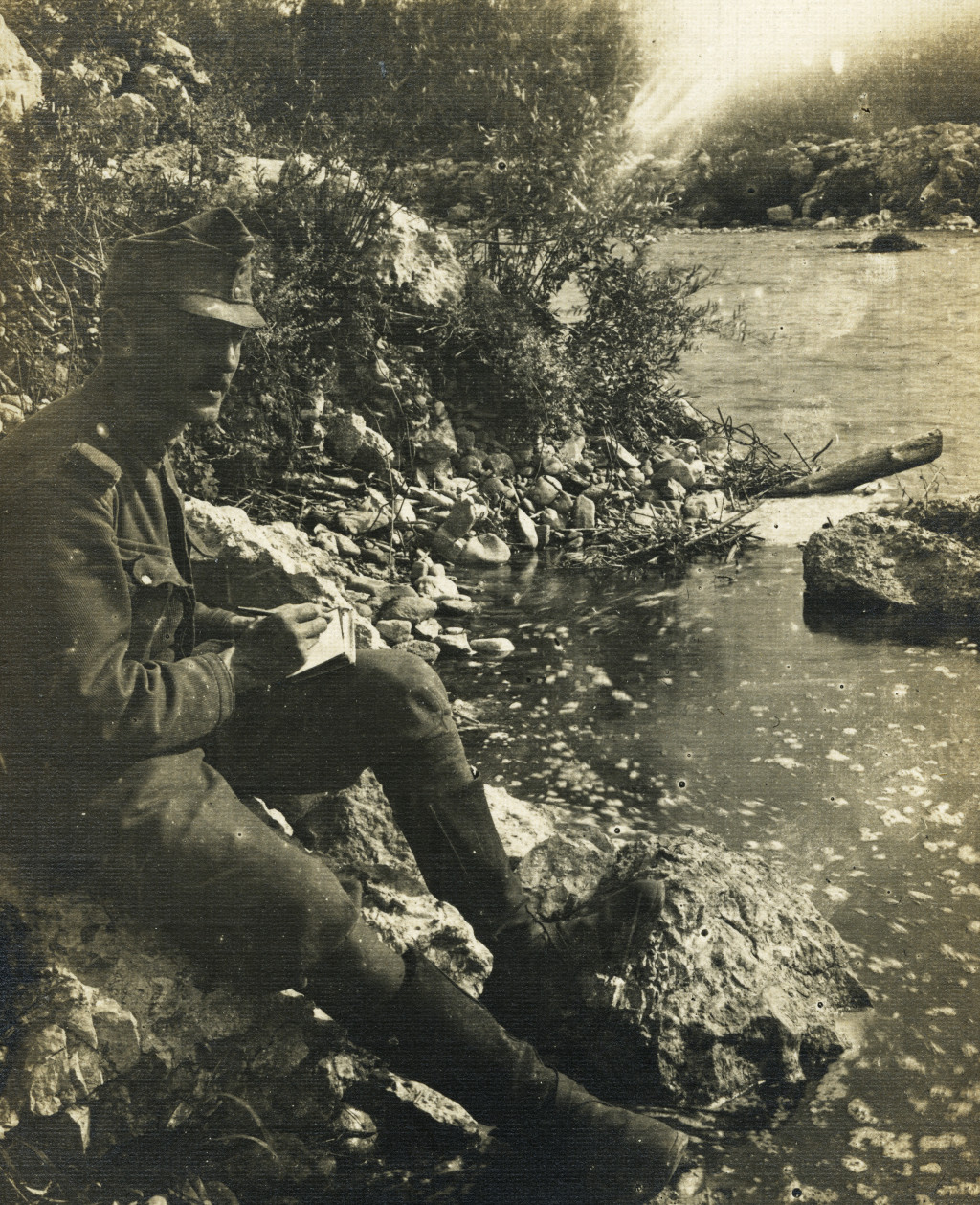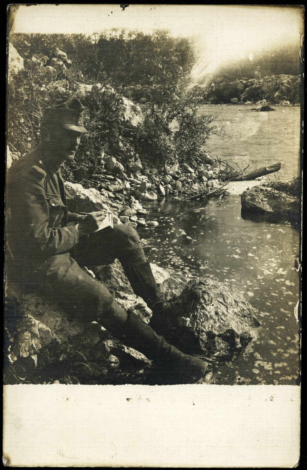 Tábori posta 417, Virágh János (1. honvéd gyalogezred), levelet ír feleségének a harctéri folyóparton, egyenruha, 1. világháború, katona, monarchia, 1917. X. 5., 1910-es évek, Eredeti fotó, papírkép, hátulján feliratozott Tábori posta.
