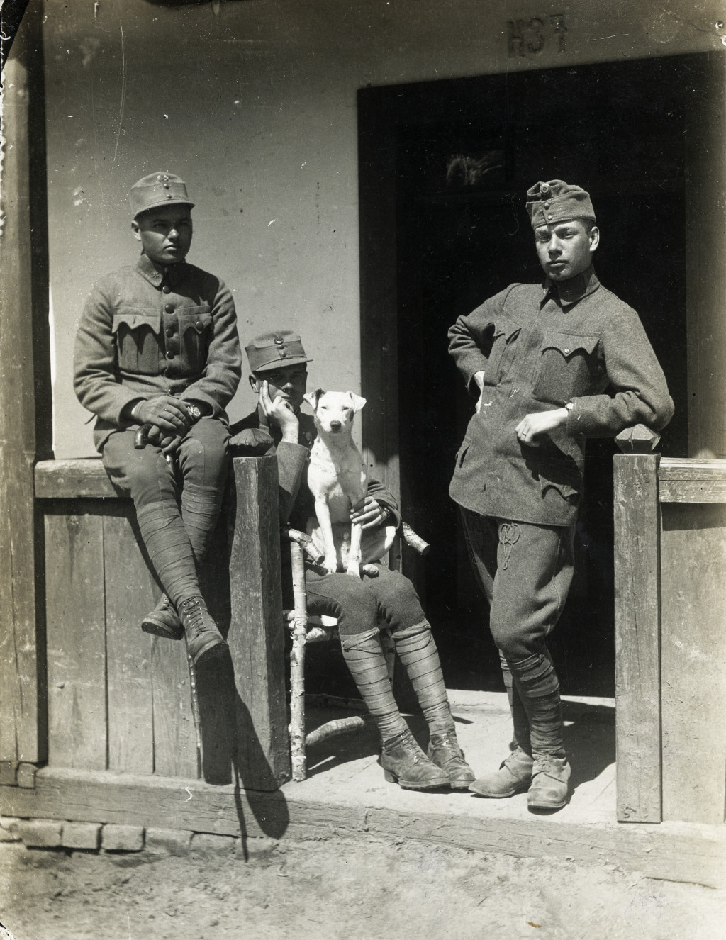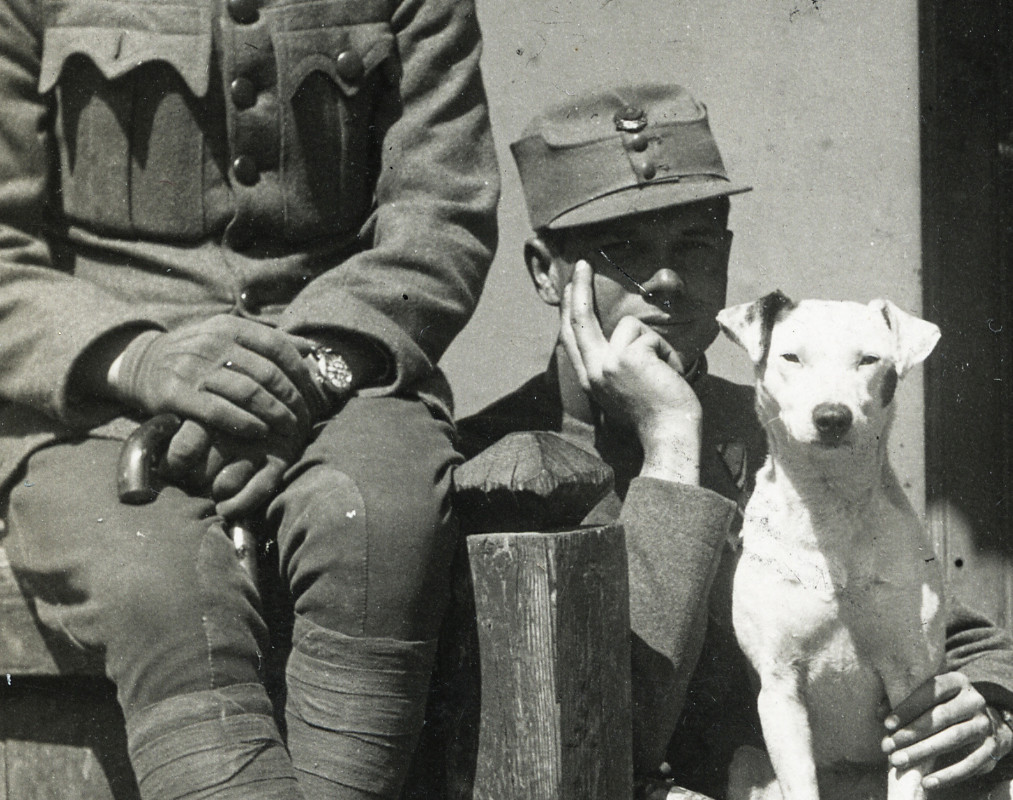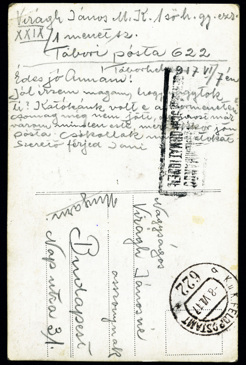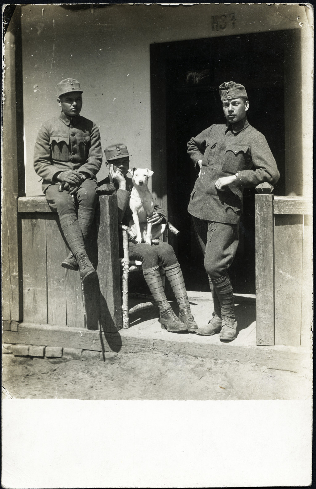 Tábori posta 622, Virágh János (1. honvéd gyalogezred), feleségének, magyar katonák kutyával, egyenruha, 1. világháború, katona, monarchia, 1917. VI. 7., 1910-es évek, Eredeti fotó, papírkép, hátulján feliratozott Tábori posta.