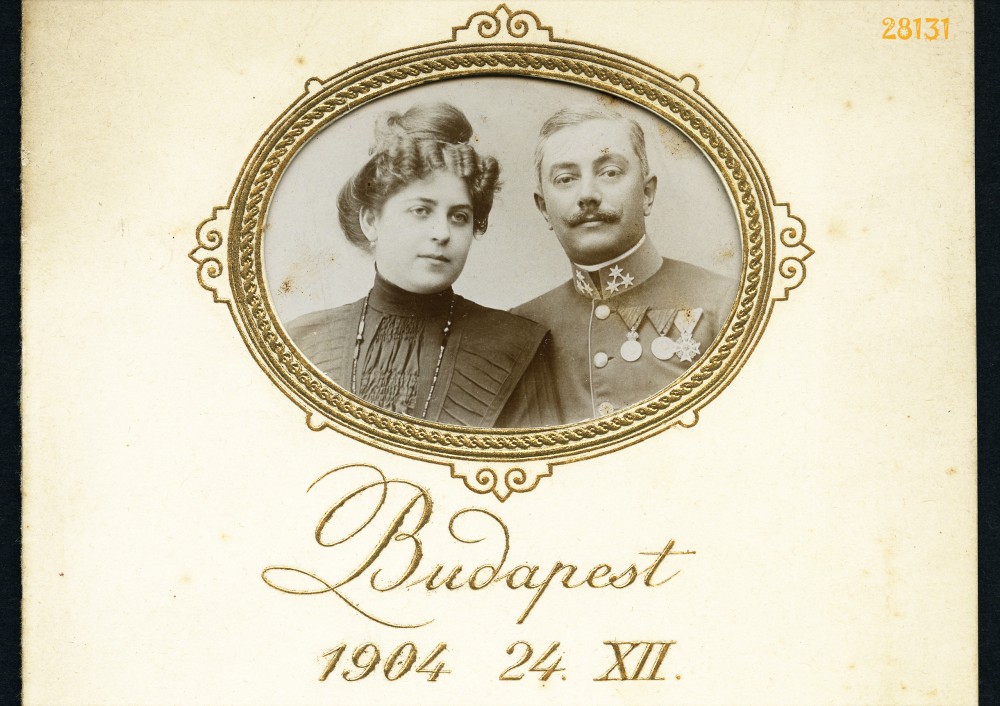 Rácz műterem, Budapest, magyar katonatiszt feleségével, egyenruha, érdemrend, portré, gyönyörű karácsonyi emlékfotó, 1904, 1900-as évek, Eredeti fotó nagyméretű díszes paszpartuban, áttetsző tasakban.