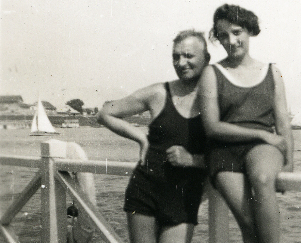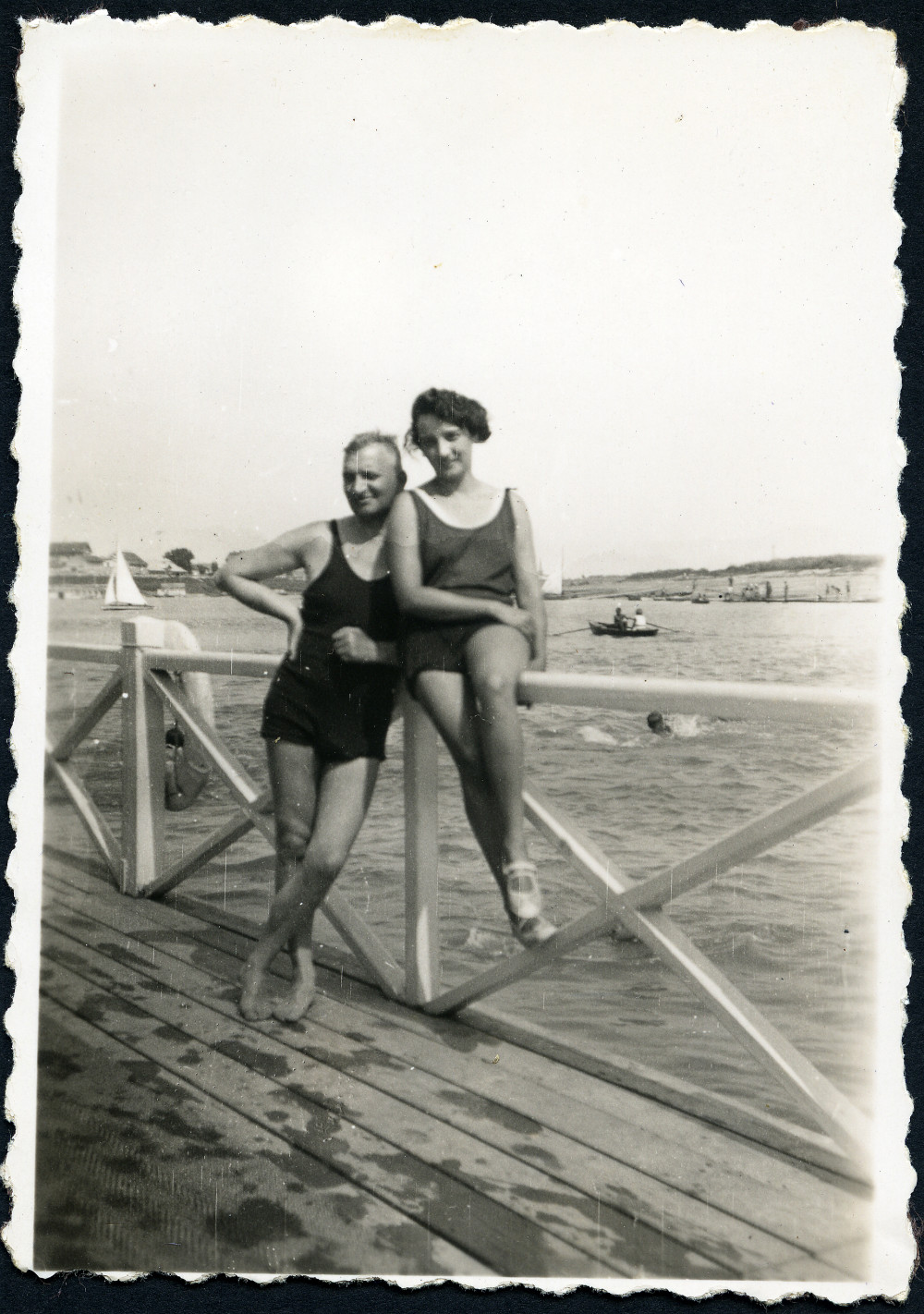 Pár fürdőruhában, Szeged, Tisza-part, vitorlás hajó, strand, fürdőélet, Horthy-korszak, helytörténet, Csongrád megye, 1932, 1930-as évek, Eredeti fotó, papírkép.