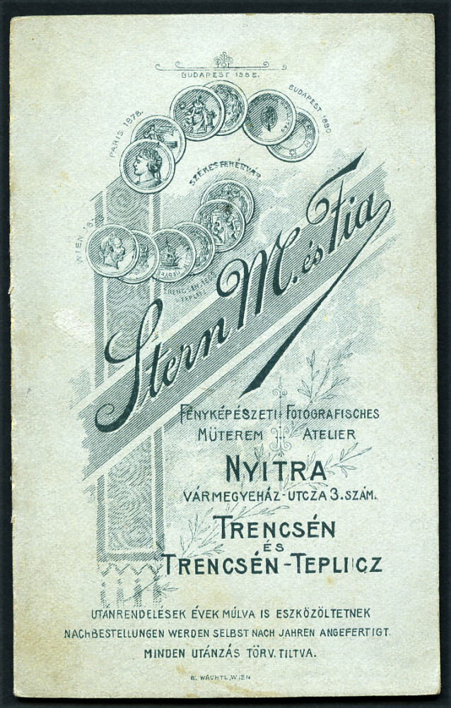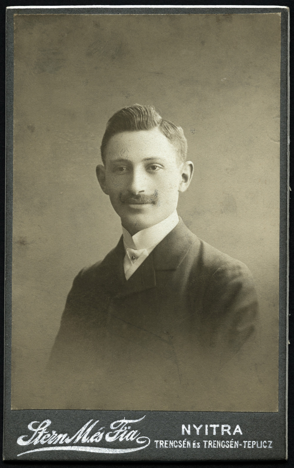 Stern Miksa és Fia műterme, Nyitra (Trencsén), Felvidék, elegáns fiatal férfi bajusszal, monarchia, 1890-es évek, Eredeti CDV, vizitkártya fotó.