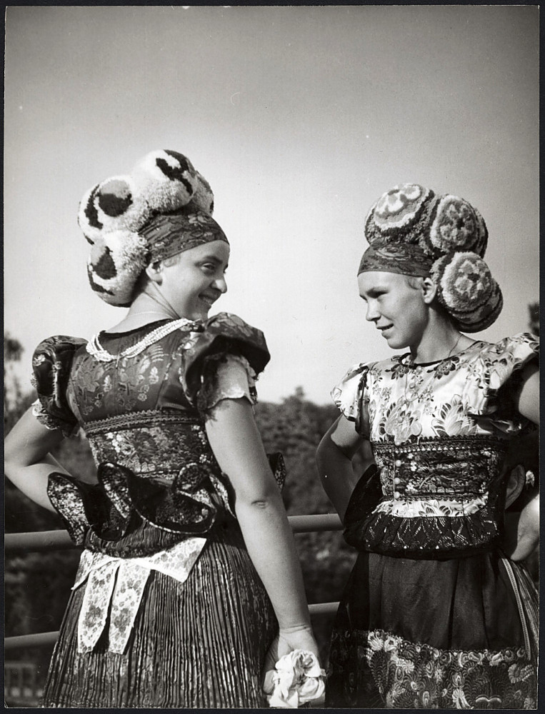 Nagyobb méret, Szendrő István fotóművészeti alkotása, lányok mezőkövesdi (Borsod-Abaúj-Zemplén megye) népviseletben, Matyók, fejfedő, 1930-as évek. Eredeti, pecséttel jelzett fotó, papírkép, Agfa Brovira papíron. Dekorációnak, ajándéknak is kiváló.