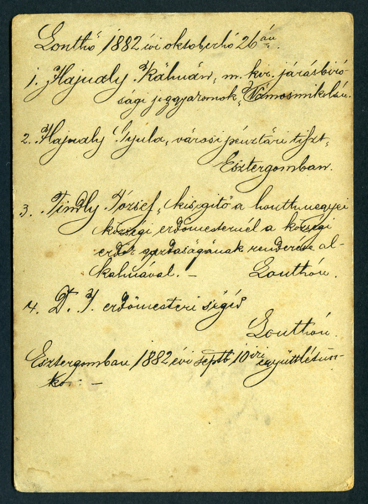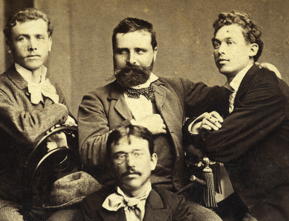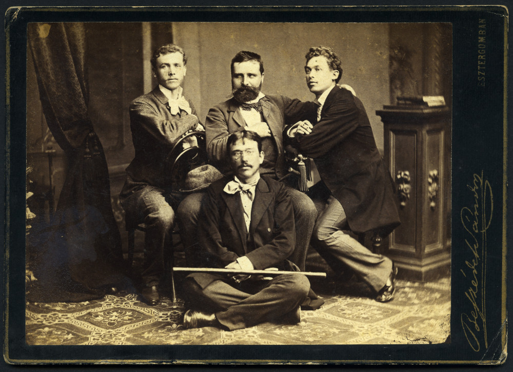 Beszédes műterem, Esztergom, baráti társaság, Hajnaly Kálmán, Hajnaly Gyula, szakáll, cvikker, bajusz, monarchia, helytörténet, 1870-es évek, Eredeti, hátoldalán feliratozott, nevesített kabinetfotó, felülete foltos.
