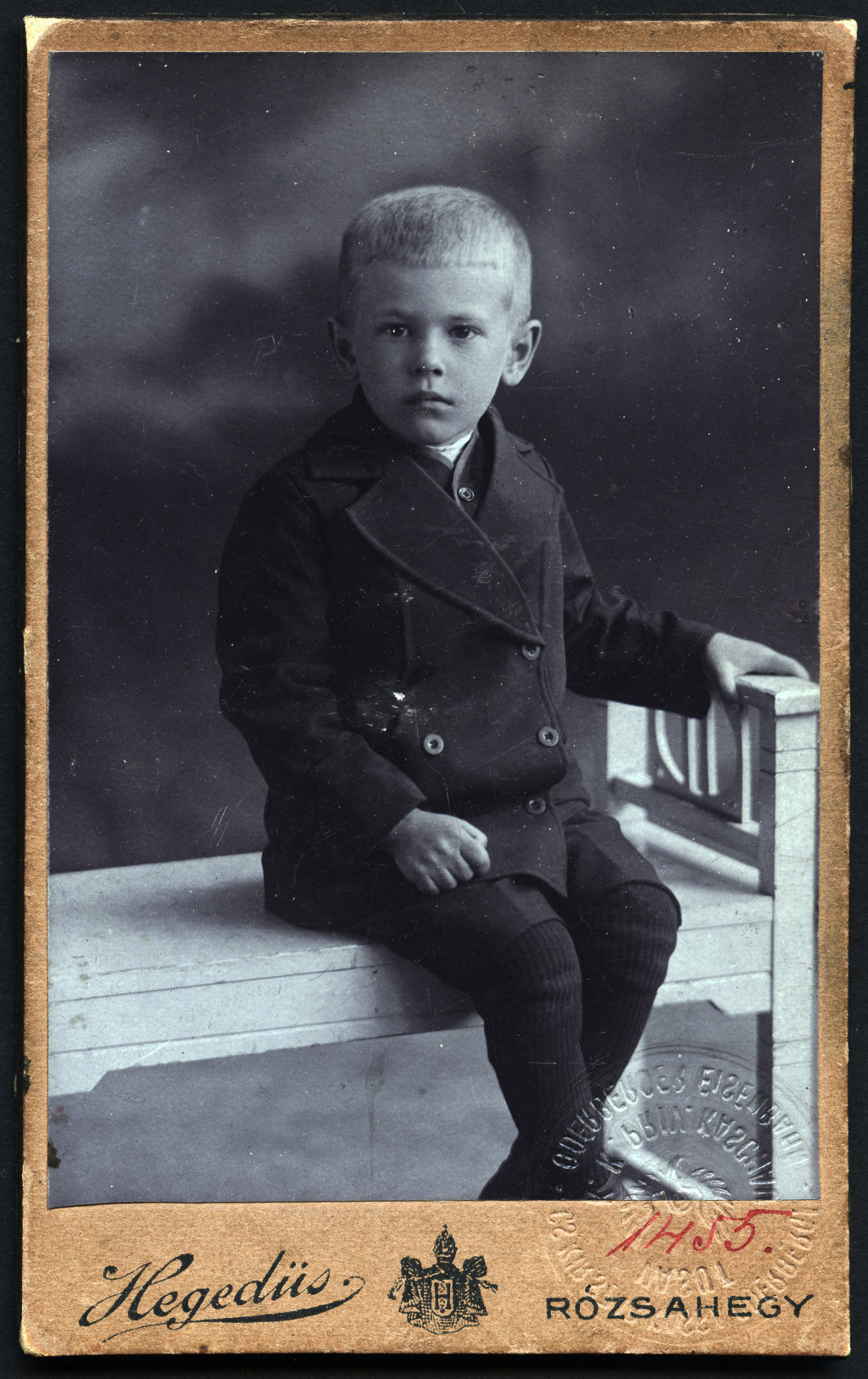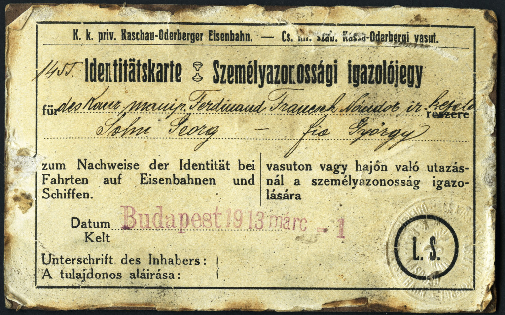 Hegedűs műterem, Rózsahegy, Felvidék, fiú, Francsek György portréja, Kassa-Oderbergi Vasút (KsOD) Személyazonossági igazolójegy, a társaság mélynyomó bélyegzőjével ellátva, közlekedés, monarchia, 1913, 1910-es évek, Eredeti CDV, vizitkártya fotó ra