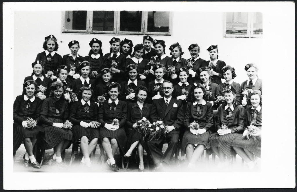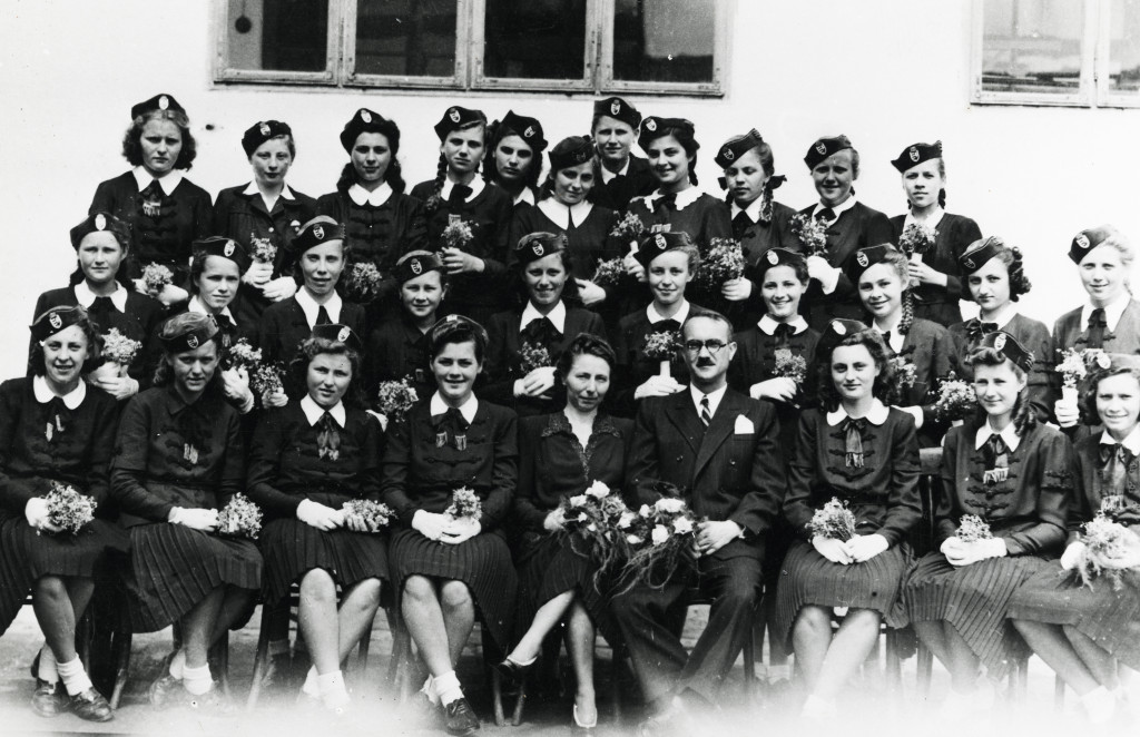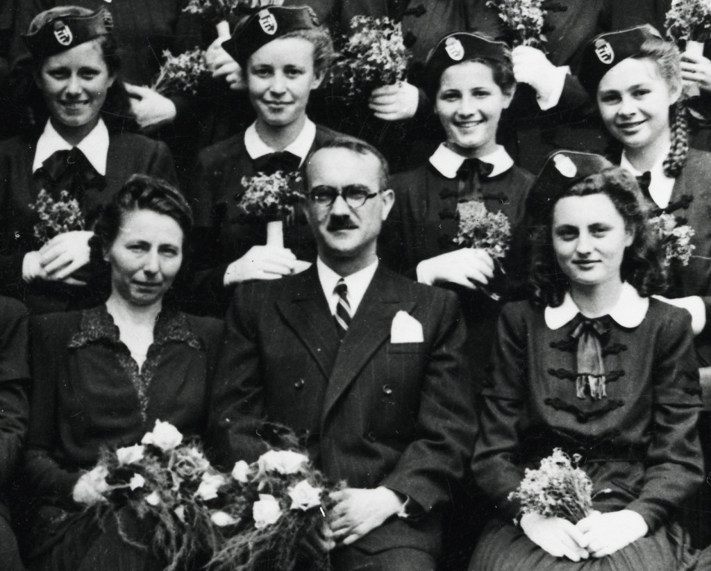 Iskolás lányok magyaros ruhában, Zenta, Vajdaság, magyar sapkajelvény, osztály, tanár, évzáró, helytörténet, Horthy-korszak, 1943, 1940-es évek, Eredeti fotó, hátulján feliratozott papírkép.