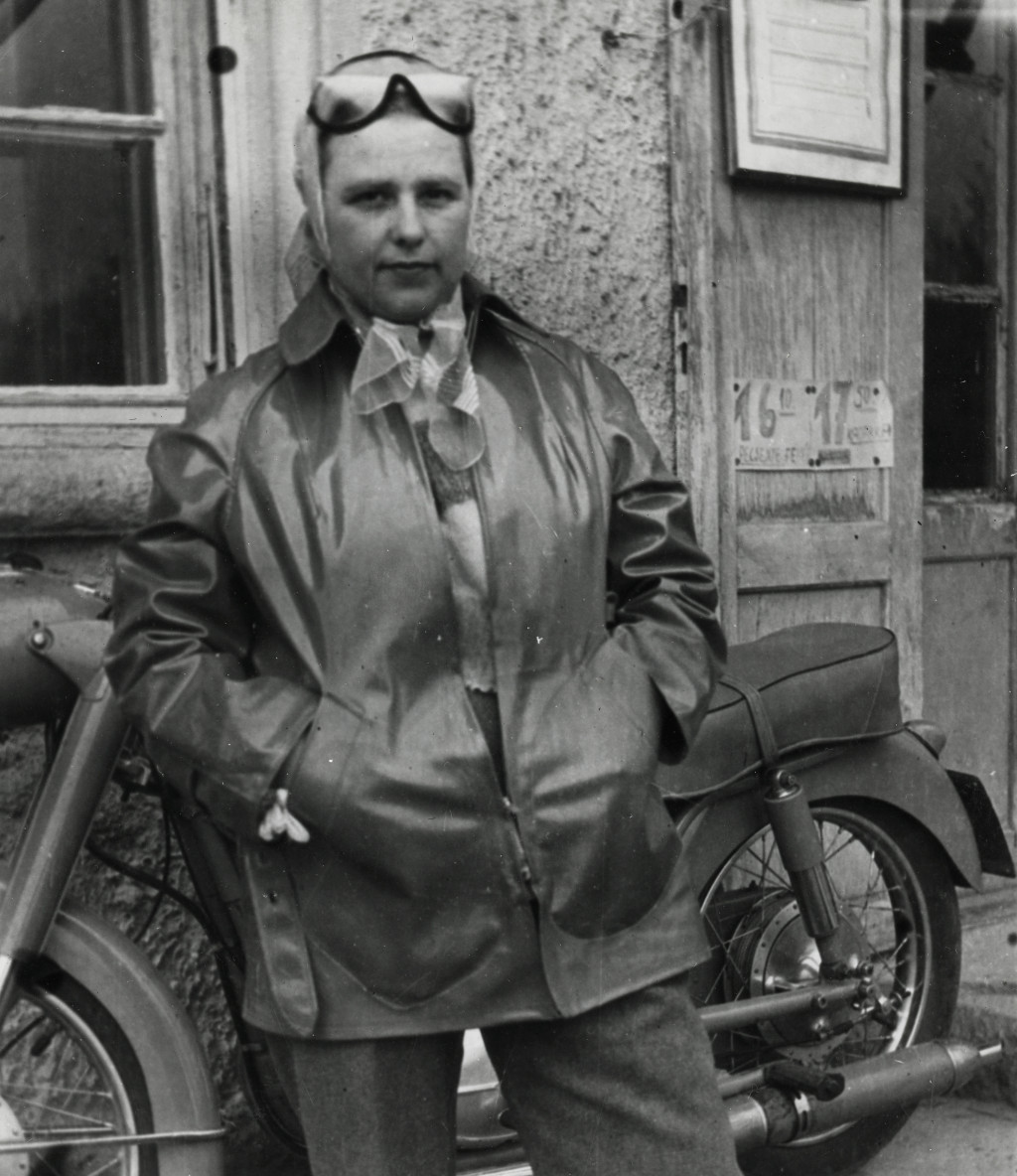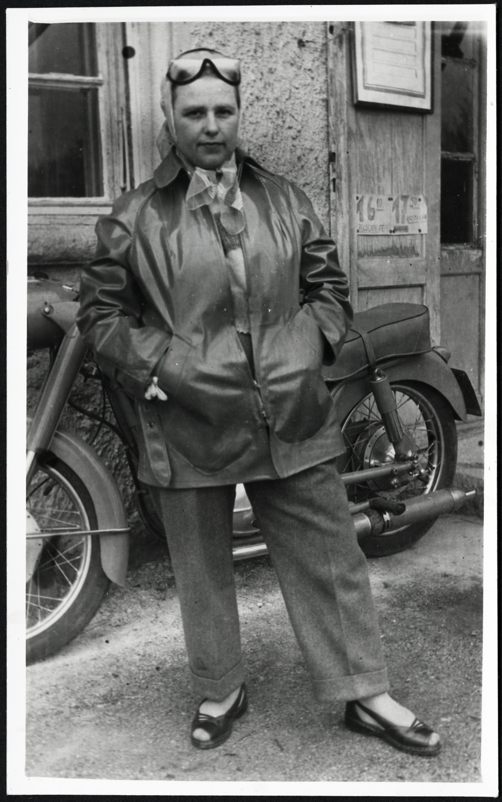 Nő motoros ruhában, Pannonia TLT motorkerékpárral, jármű, közlekedés, szocializmus, 1950-es évek, Eredeti fotó, papírkép.