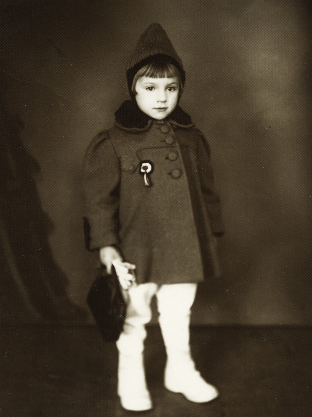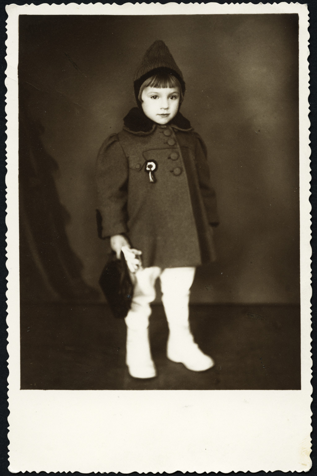 MONA LISA műterem, Albertfalva, kislány télikabátban, kokárdával, helytörténet, Horthy-korszak, 1930-as évek, Eredeti, pecséttel jelzett fotó, hátulján feliratozott papírkép.