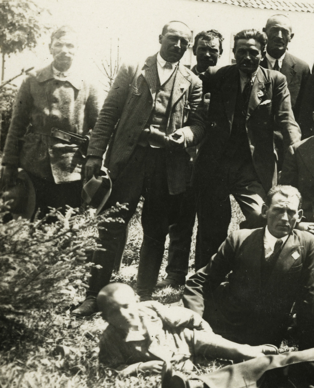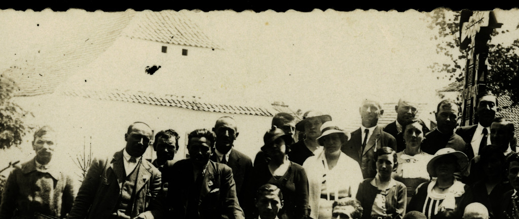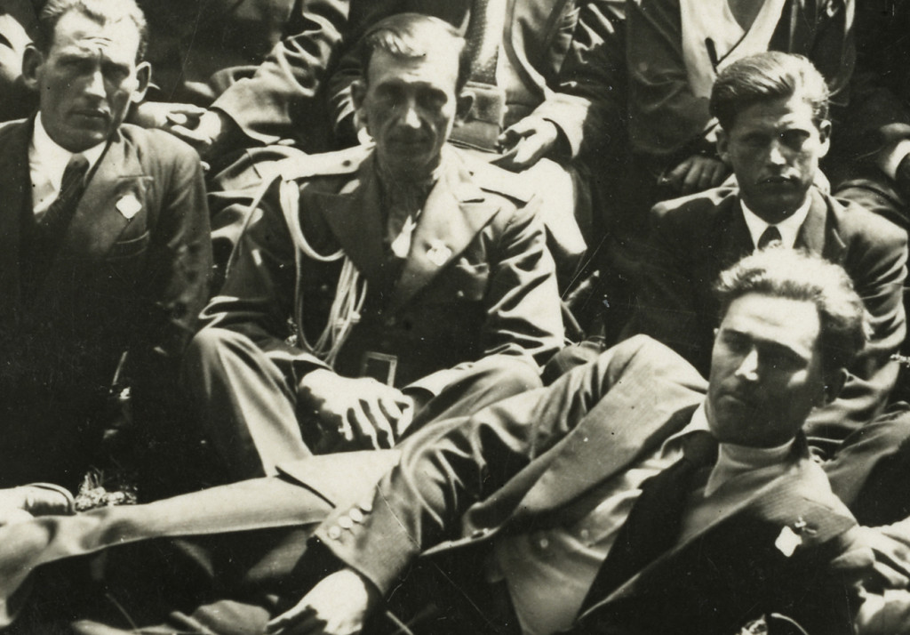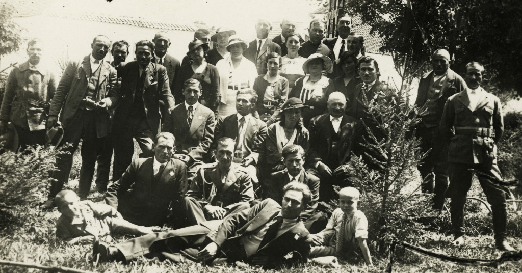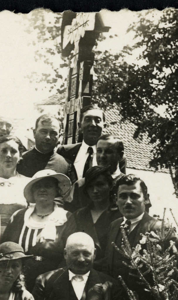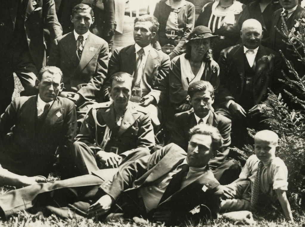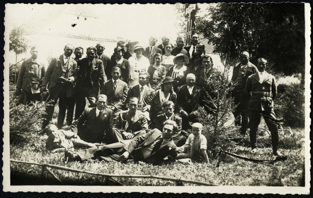 Nyilas Foto Erdély, Székelyföld, elegáns nők férfiakkal, katona egyenruhában, férfiak különös kitűzővel, Horthy-korszak, 1920-as évek, Eredeti, pecséttel jelzett fotó, papírkép.