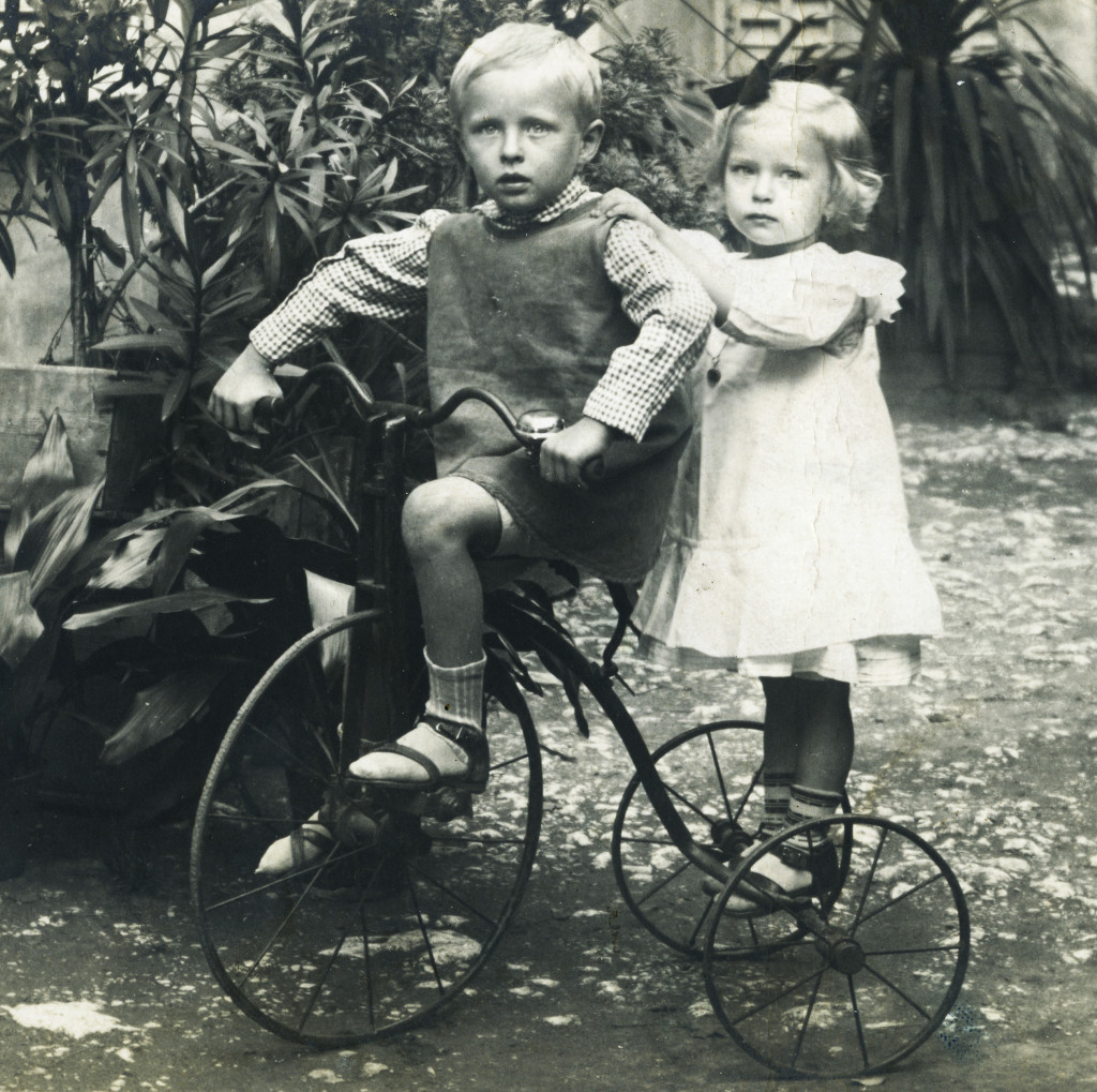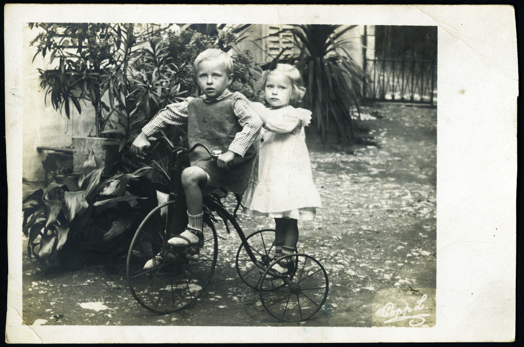 Popp L. (?) fotográfus, Fiume, gyerekek (Lurkó és Magdus) triciklin, játék, jármű, közlekedés, monarchia, 1910, 1910-es évek, Eredeti hátulján feliratozott fotó, papírkép.