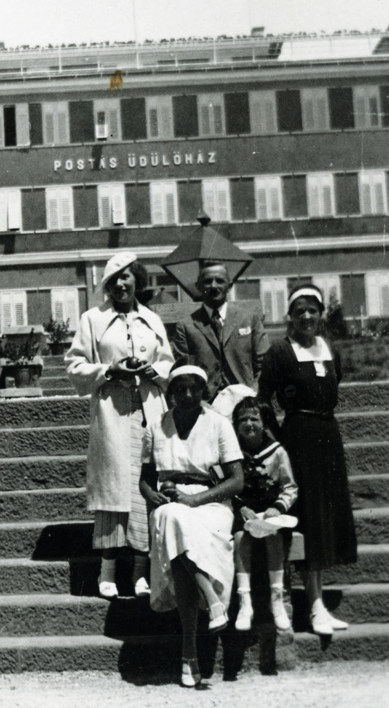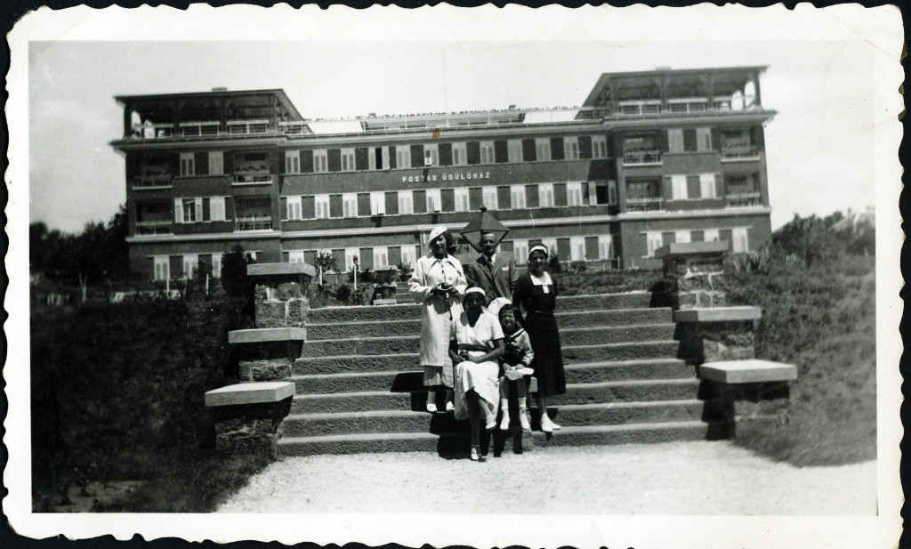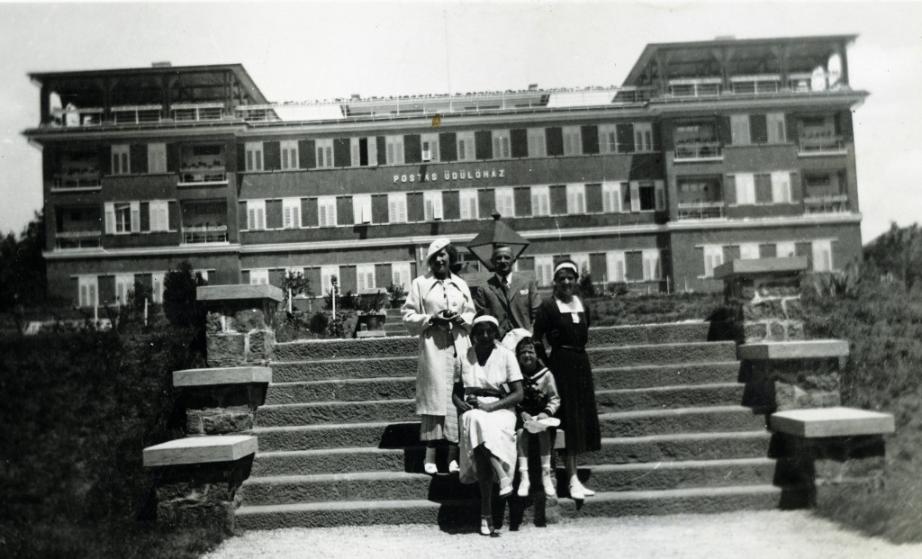 Postás üdülőház, Balatonalmádi (fürdő), elegáns család az üdülőnél, Balaton, helytörténet, 1930-as évek, Eredeti fotó, papírkép, hátulján ragasztásnyommal.