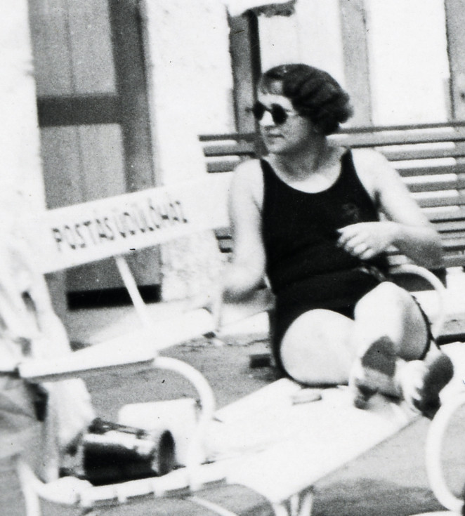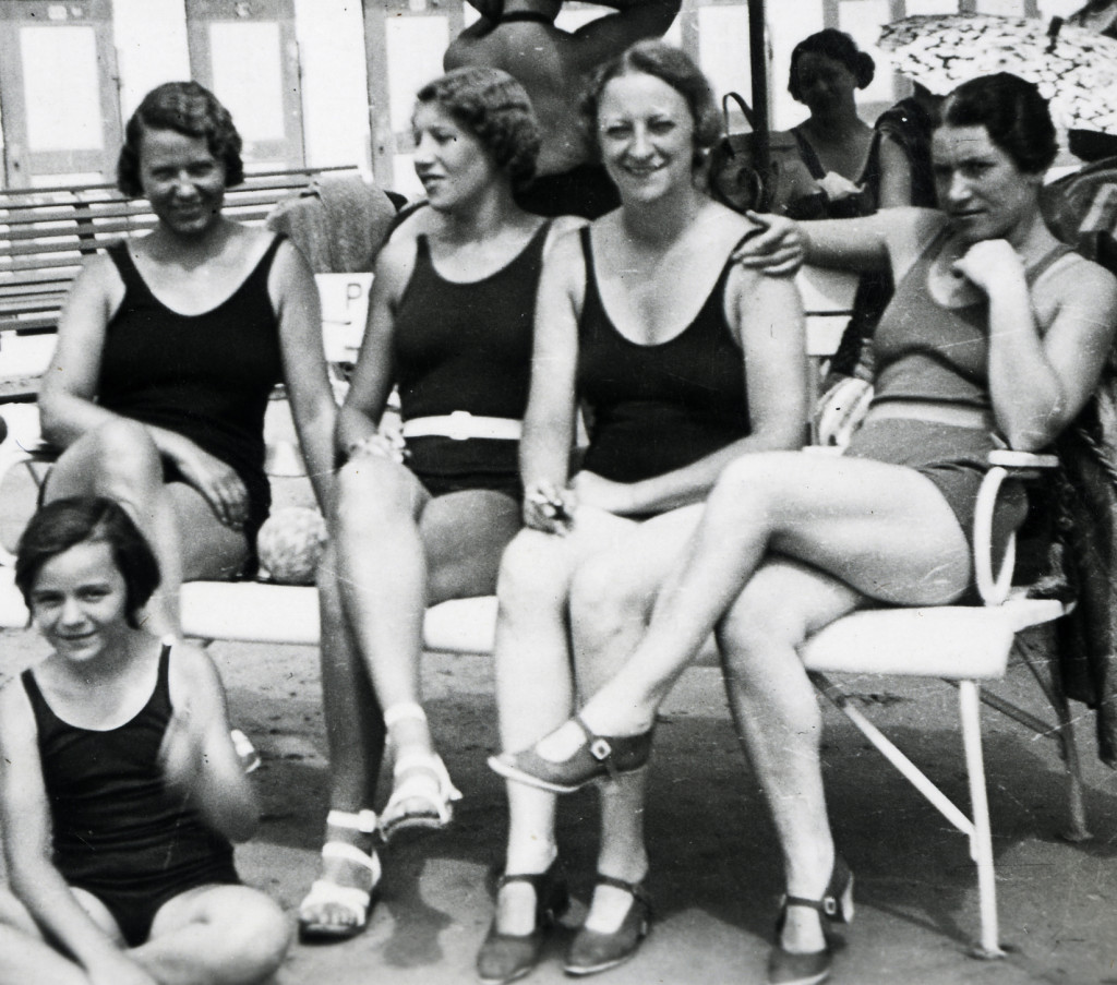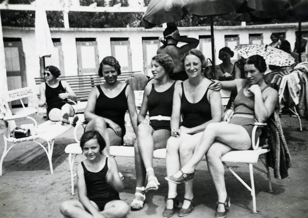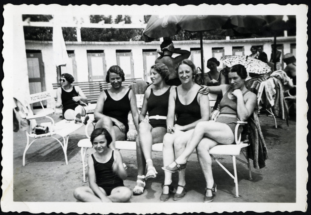 Gláser-Foto, Balatonalmádi, nők fürdőruhában, strand, fürdő, Balaton, „Postás üdülőház” felirat a padon, helytörténet, 1930-as évek, Eredeti fotó, pecséttel jelzett papírkép.