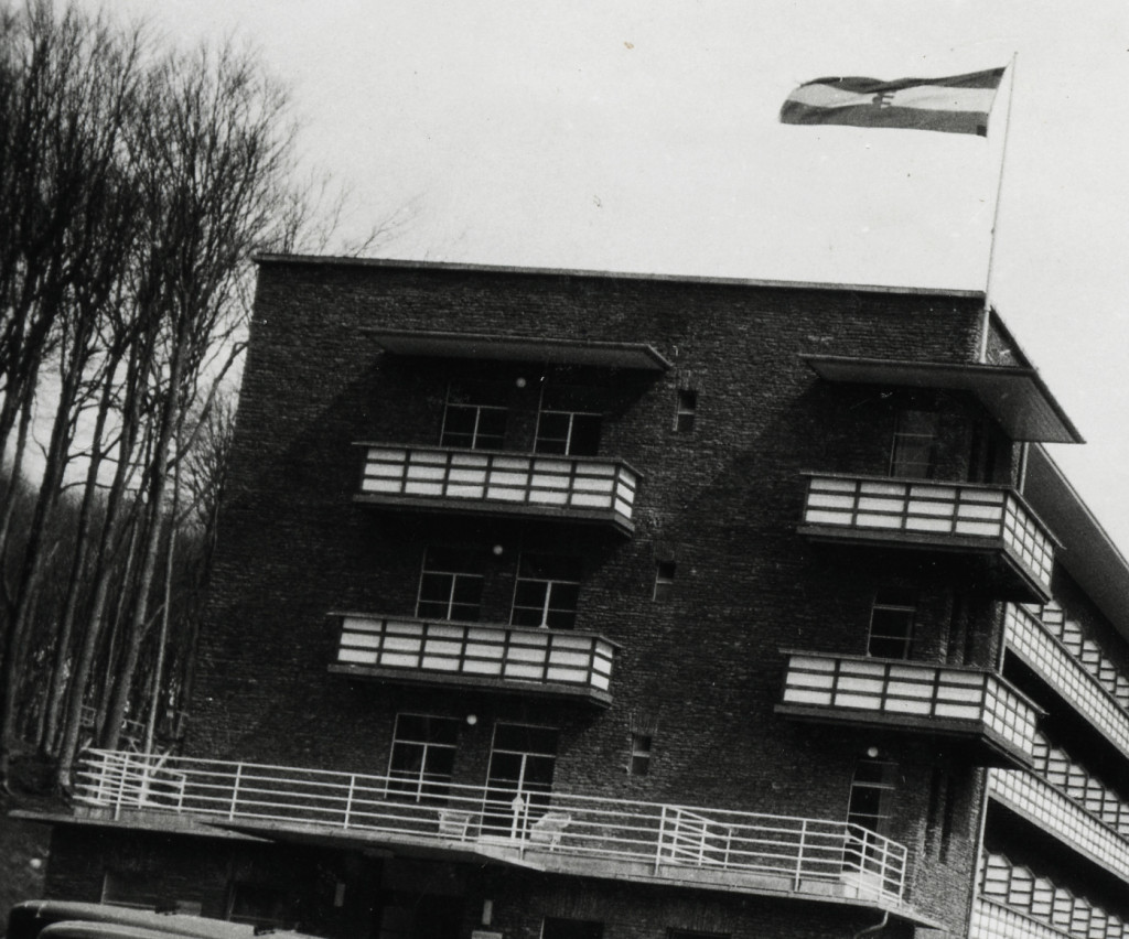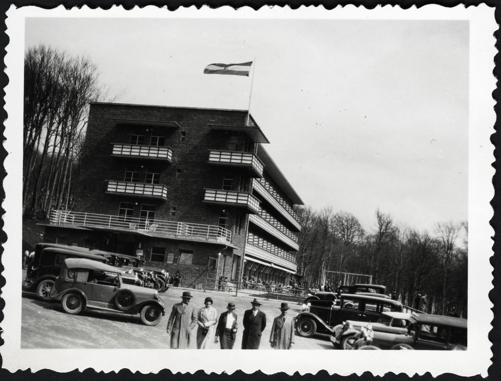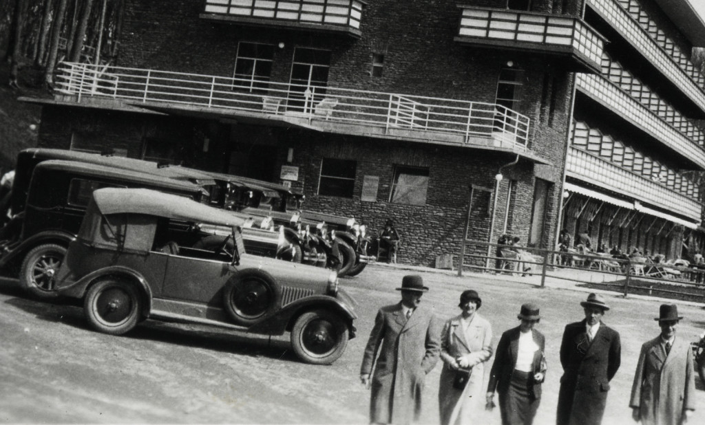 Mátrai Gyógyintézet kékestetői egysége, úri társaság a szállónál, Mátra, parkoló autók, jármű, közlekedés, vendéglátás, turisztika, Horthy-korszak, 1930-as évek, Eredeti fotó, papírkép, hátulján ragasztásnyomok, sérülés.