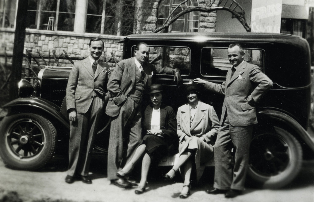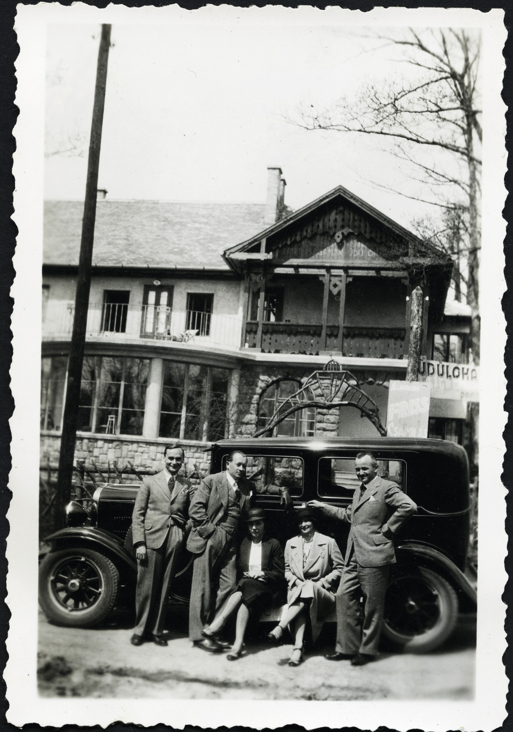 Úri társaság az Üdülőháznál, Mátrafüred, Hudson Essex Super Six amerikai személygépkocsi, vendéglátás, üdülés, Mátra, autó, jármű, közlekedés, Horthy-korszak, 1930-as évek, Eredeti fotó, papírkép, hátulján ragasztásnyomok, sérülés.