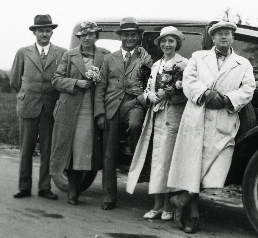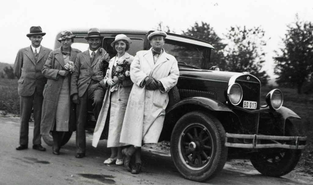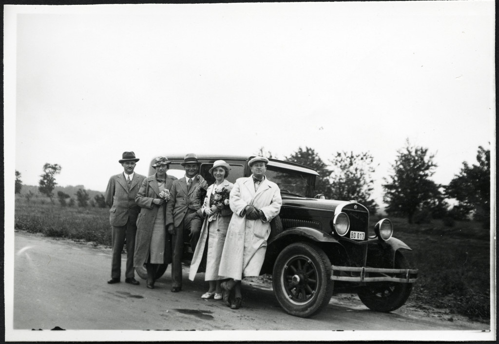 Hudson Essex Super Six amerikai személygépkocsi magyar rendszámmal (BD 017), elegáns párok virággal, autó, jármű, közlekedés, Horthy-korszak, 1930-as évek, Eredeti fotó, papírkép, hátulján ragasztásnyomok, sérülés.