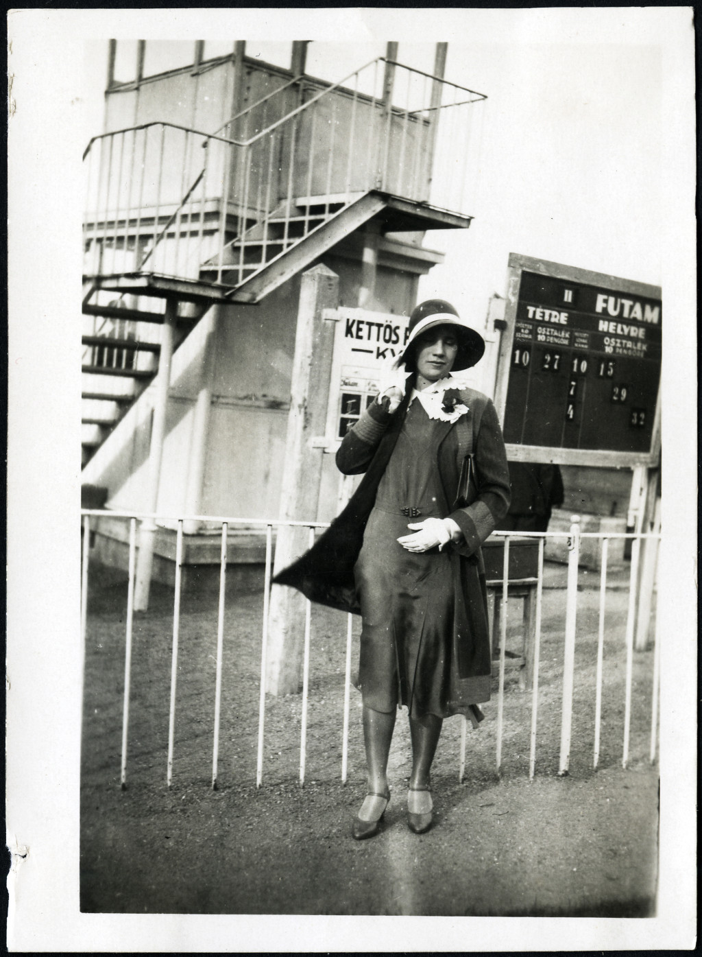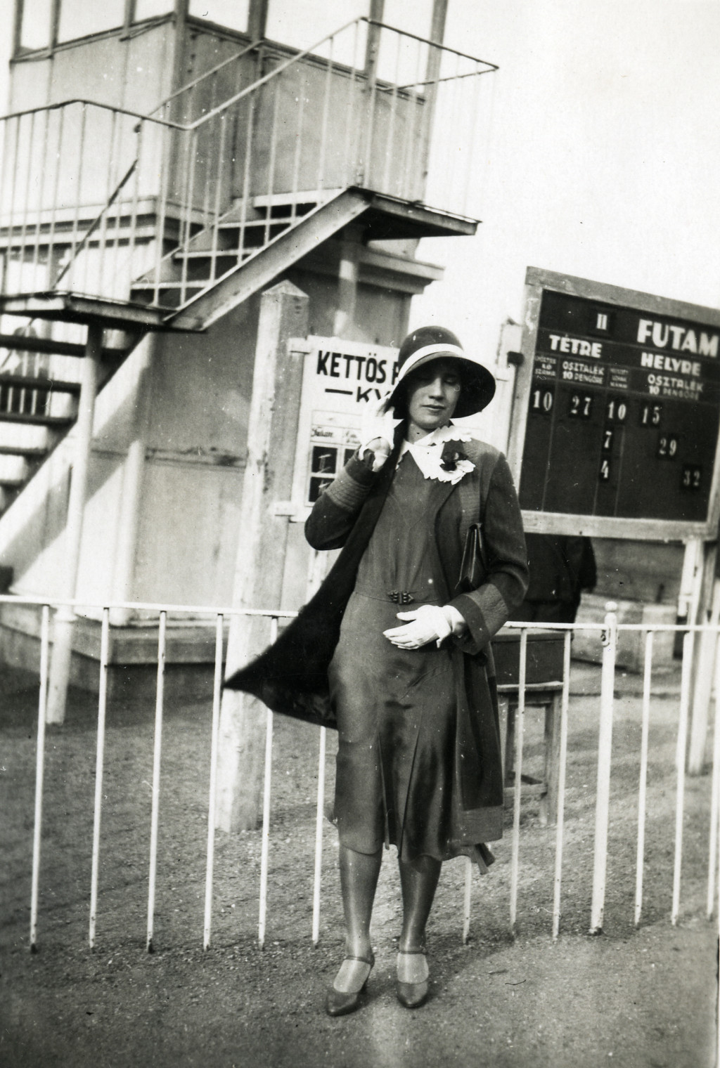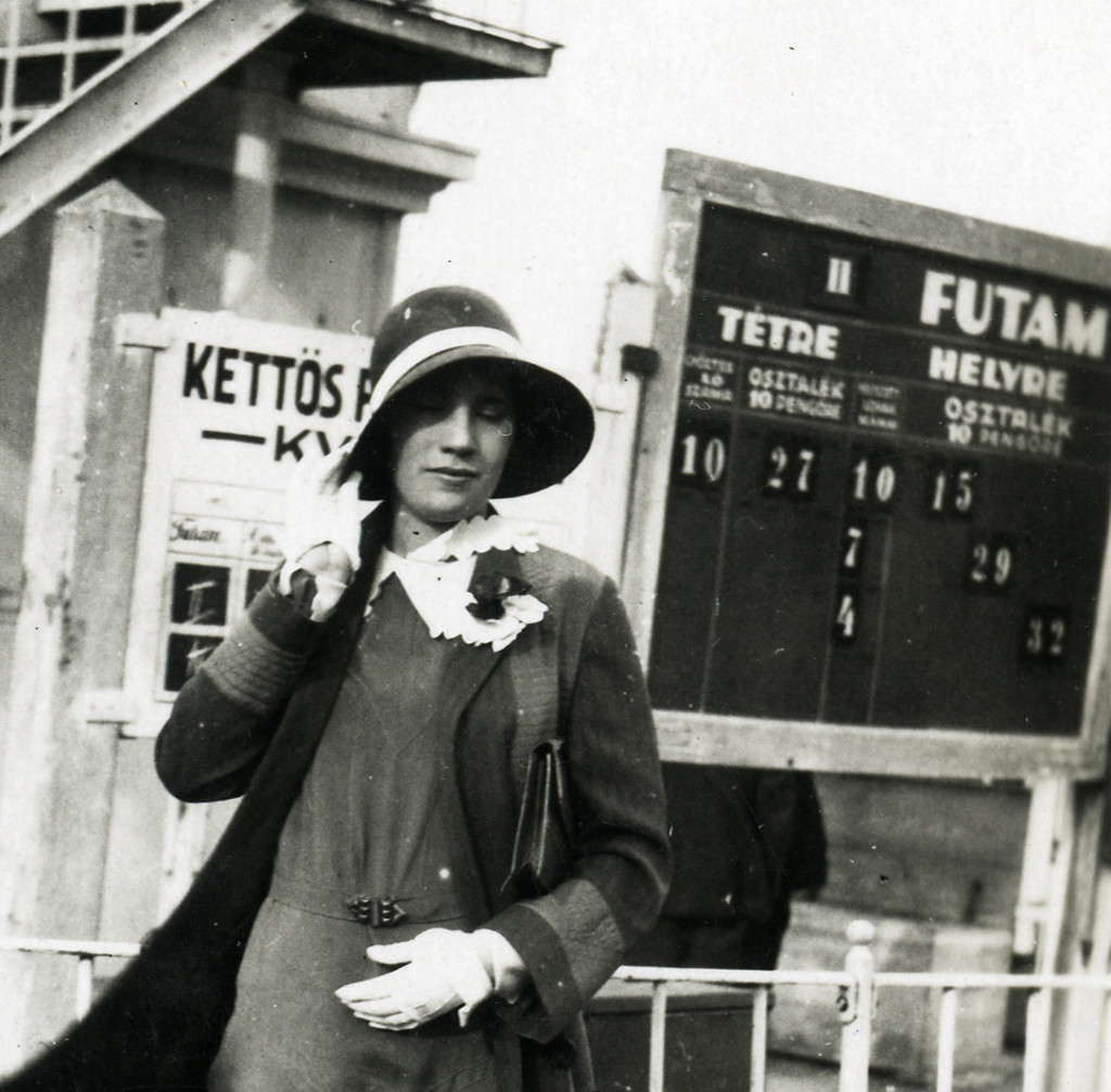 Elegáns nő a Lóverseny téren, Budapest, kalap, sport, felirat, Horthy-korszak, 1930-as évek, Eredeti fotó, papírkép.