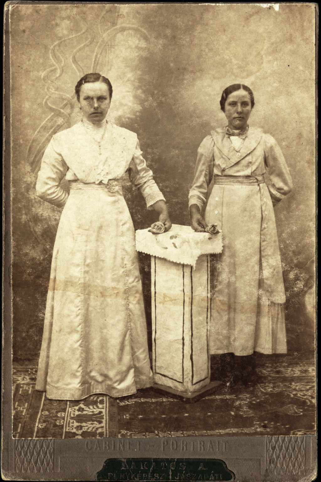 Lakatos A. fényképész műterme, Jászapáti, lányok virággal, egyszerű háttér, néprajz, helytörténet, monarchia, 1900-as évek, Eredeti kabinetfotó, ritka műterem.